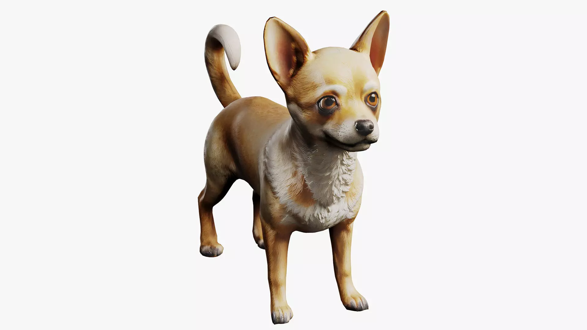 This 3D model of a Chihuahua is meticulously designed in a realistic style, capturing the breed's signature features, including its smooth coat, expressive eyes, and petite, elegant build. The model showcases finely detailed fur textures, adding lifelike realism to every strand and surface. The Chihuahua's natural pose and charming expression make it perfect for a variety of creative applications, including animations, visualizations, advertising, and game design.