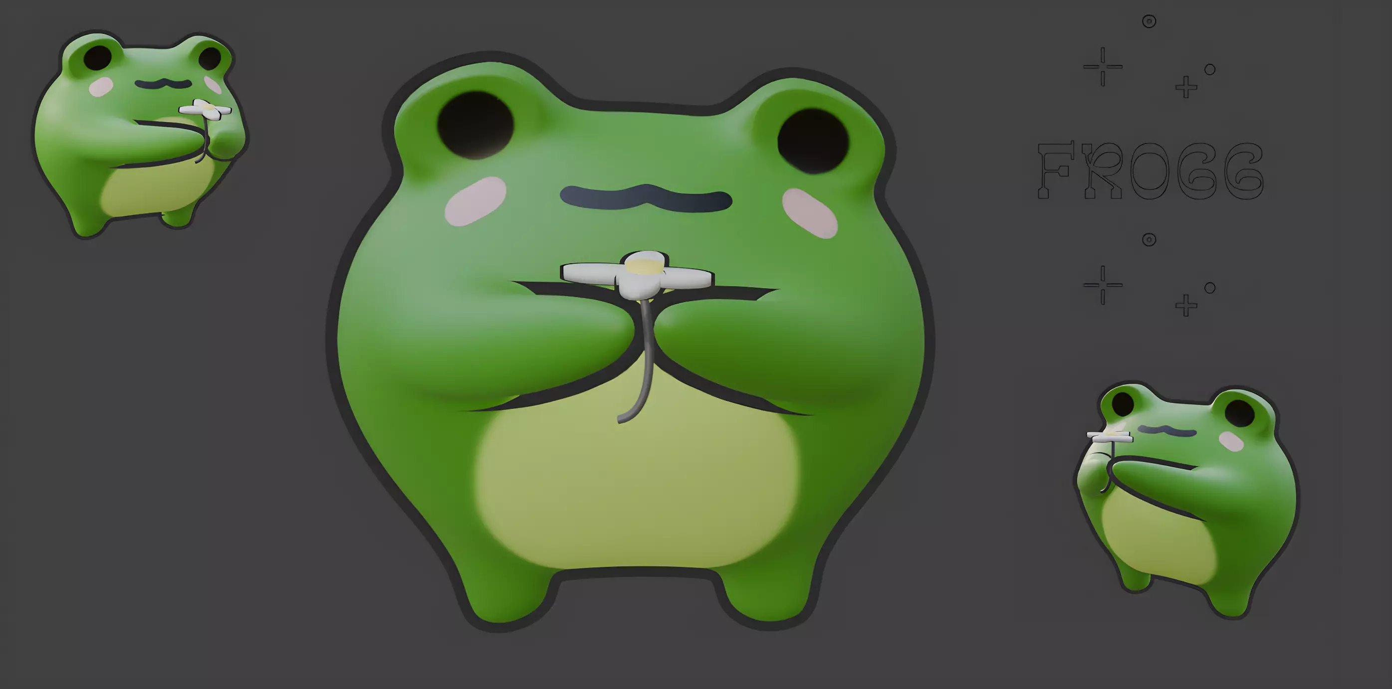 A cute 3D frog holding a small white flower, perfect for use in games or 3D printing. The model features smooth, stylized shapes and vibrant colors.