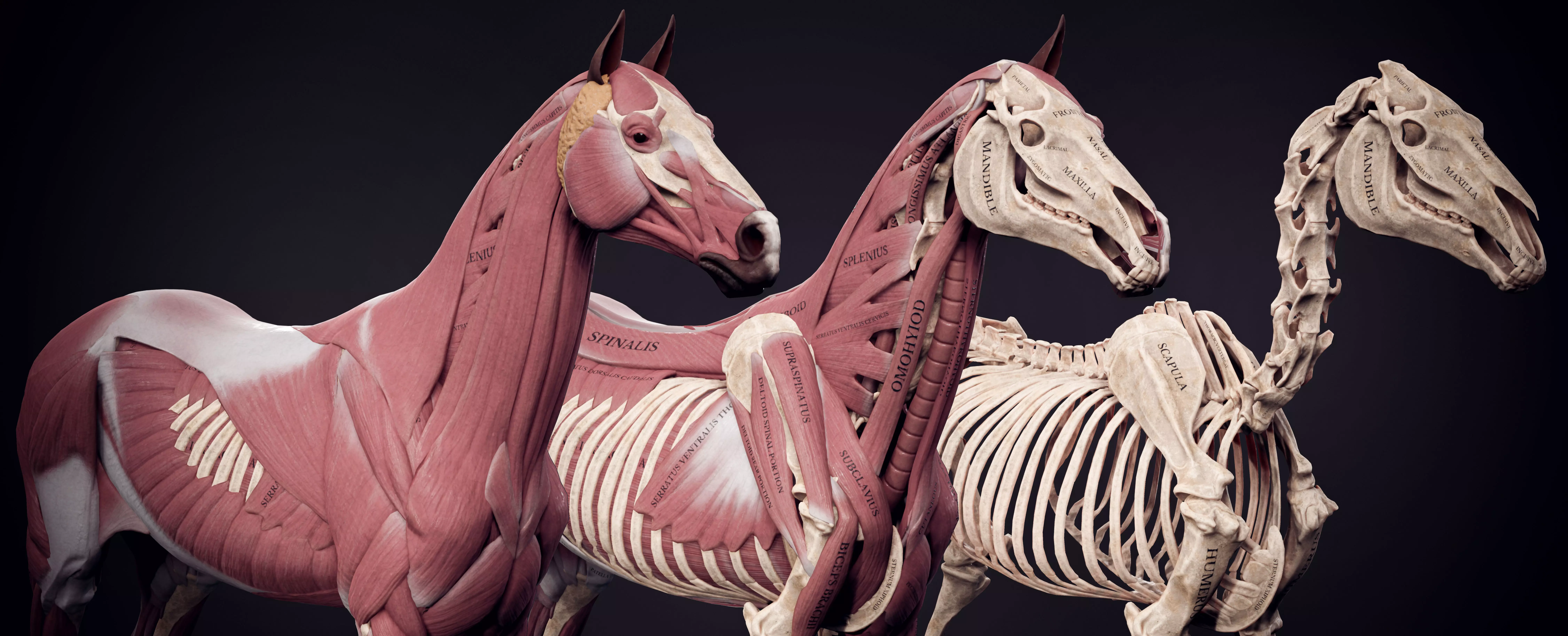 3D Horse Anatomy Kit represents accurate landmarks with all muscles and bones labled.