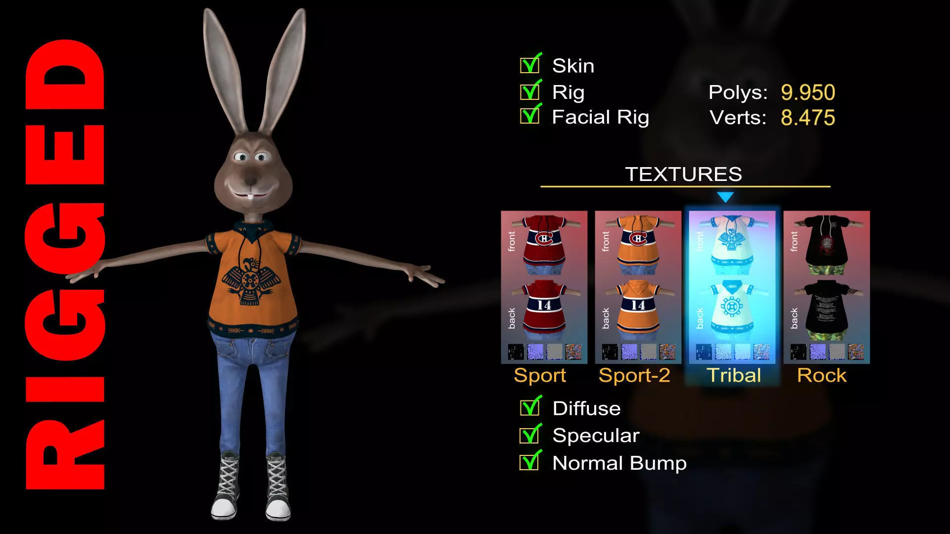 Textures: Diffuse, Normal, Specular. Includes 4 additional texture choices All maps are 8192x8192 pixels. Contains additional bones for facial rig. Watch basic info and rig demo video: https://www.youtube.com/watch?v=IG0GlJSrkHA