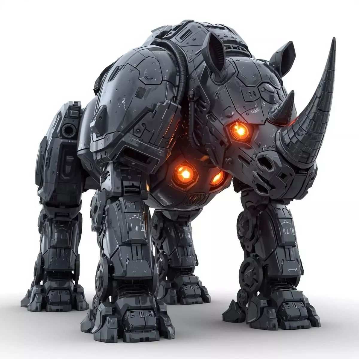 This high-resolution 3D model features a massive sci-fi robot rhino with a heavy armored mechanical body. The design is constructed from dark gray steel materials and is highlighted by glowing orange energy cores that represent power and endurance. The model is presented as a full-body asset isolated on a clean white background for easy integration into digital projects.