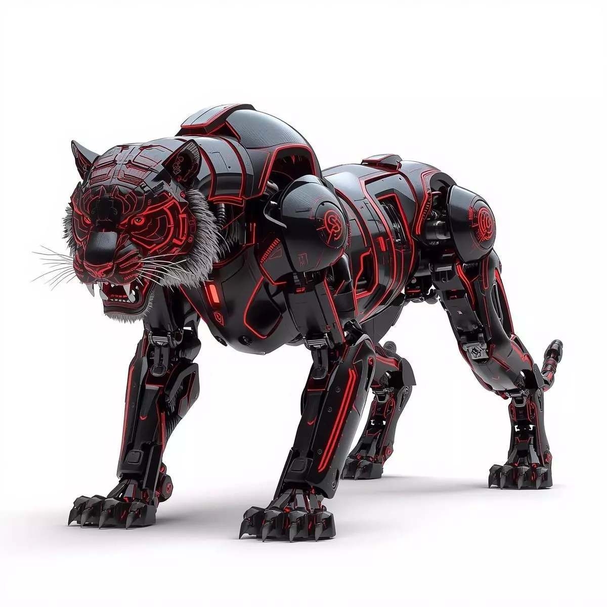 A muscular high-resolution 3D model of a mechanical tiger featuring articulated robotic joints. The body is crafted from black steel with red neon stripes representing aggression and speed, complete with glowing eyes and an aggressive stance.