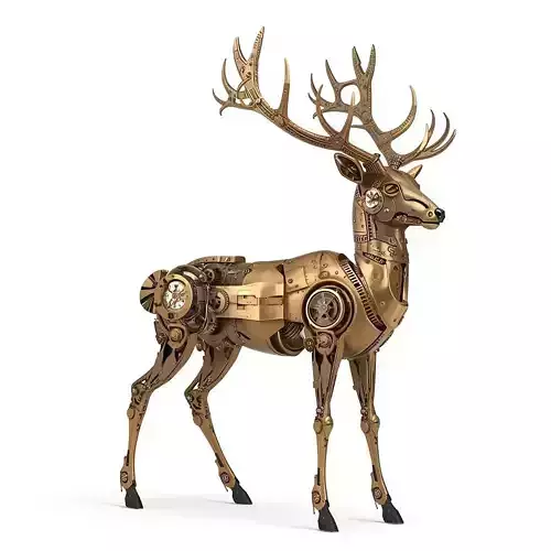 A high-quality 3D model of an elegant Steampunk Mechanical Deer, designed for professional use in games, cinematic animations, and refined Victorian-style virtual environments. This automaton features a slender, graceful frame constructed from polished brass and bronze plating, complete with gear-driven joints and magnificent, intricately detailed clockwork antlers. Please note that this model is not rigged. It is prepared for immediate integration into your preferred rendering engine or 3D software.