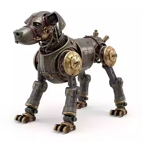 A high-quality 3D model of a sturdy Steampunk Mechanical Dog, designed for professional use in games, cinematic animations, and industrial-themed virtual environments. This canine automaton features a robust frame constructed from weathered brass and iron armor plating, complete with visible clockwork gears in the joints and steam-powered pistons in the legs. Please note that this model is not rigged. It is prepared for immediate integration into your preferred rendering engine or 3D software.