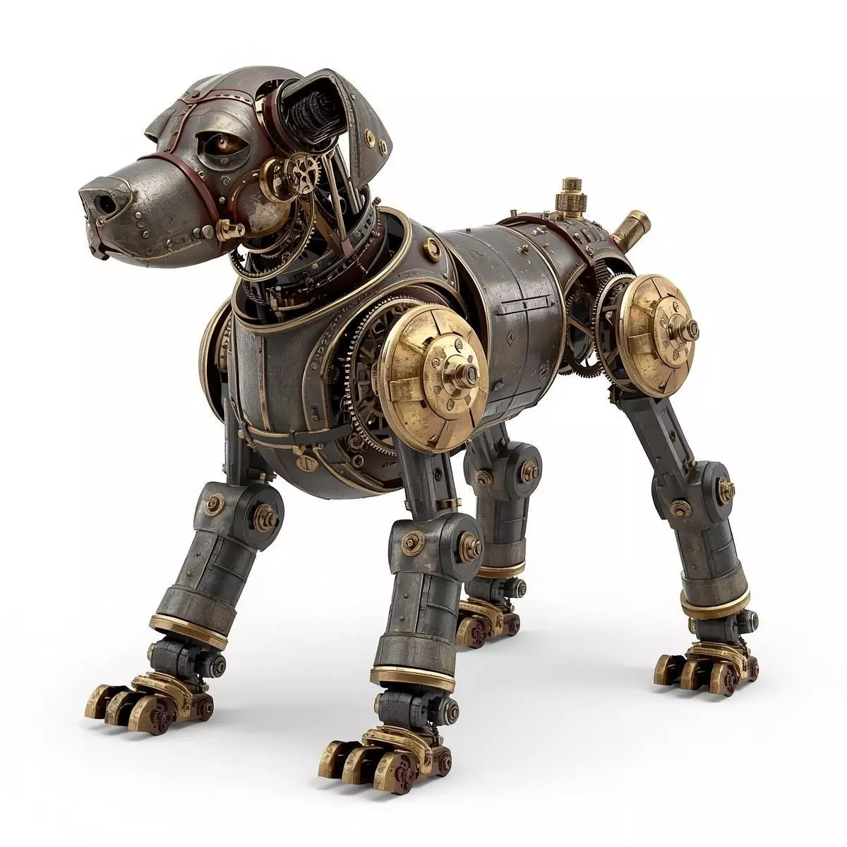 Tagssteampunk, dog, mechanical, automaton, robot, armored, clockwork, gears, steam-powered, canine, sci-fi, fantasy, game asset, 3d model, vintage, industrial, machinery, pistons, victorian