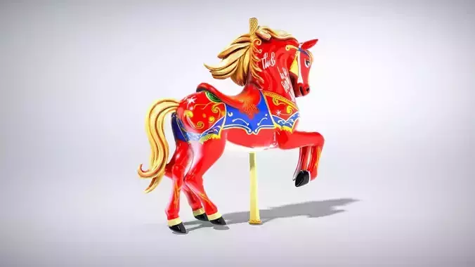 This vibrant carousel horse model showcases a glossy finish with bright colors and intricate details, perfect for nostalgic themes. Each model has 3 levels of detail with QUAD polygons: