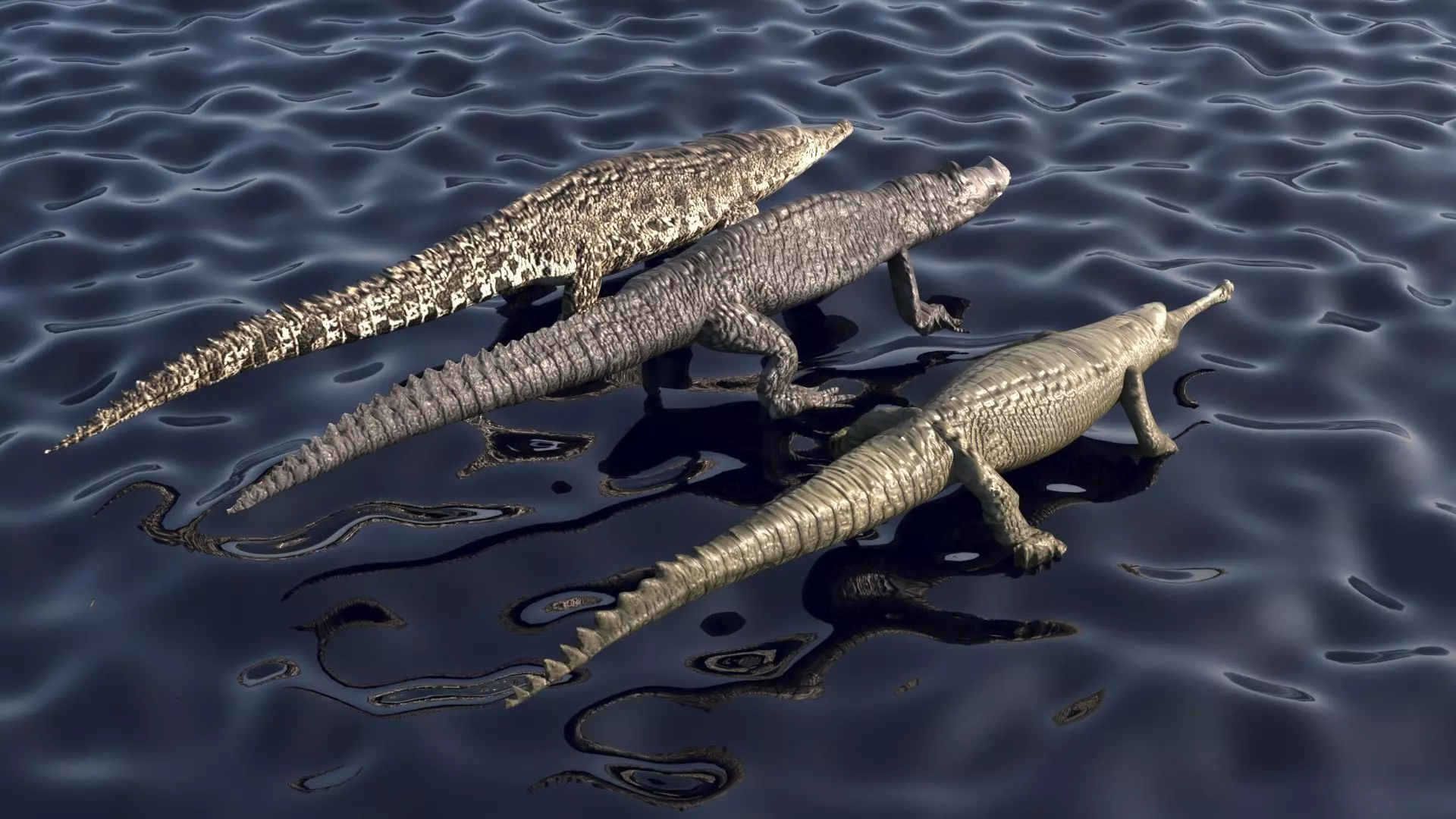 Crocodile Family In Water is a three-dimensional model of young and adult examples of a large reptile creature, which is predatory, semiaquatic reptile animal.