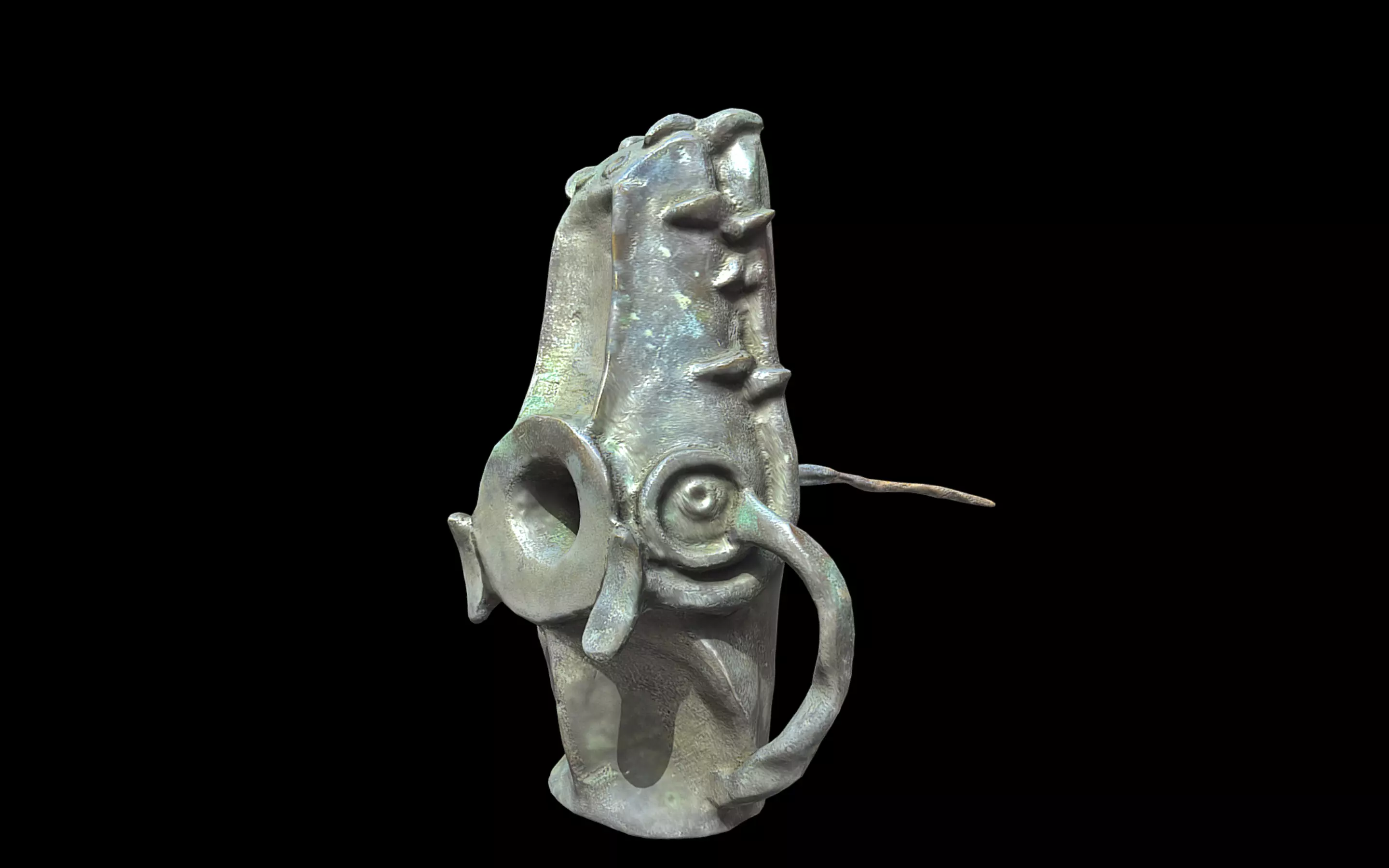 Bronze sculpture with an elongated, vertical form. The sculpture features series of raised, pointed ridges running along its surface, possibly representing the rough texture of a crocodile’s skin with circular openings and curved elements that extend outward, resembling stylized features such as eyes and limbs. A prominent, thin rod-like extension protrudes from one side. The sculpture’s surface exhibits a patina, indicating age and authenticity, with a rich texture that enhances its visual appeal.