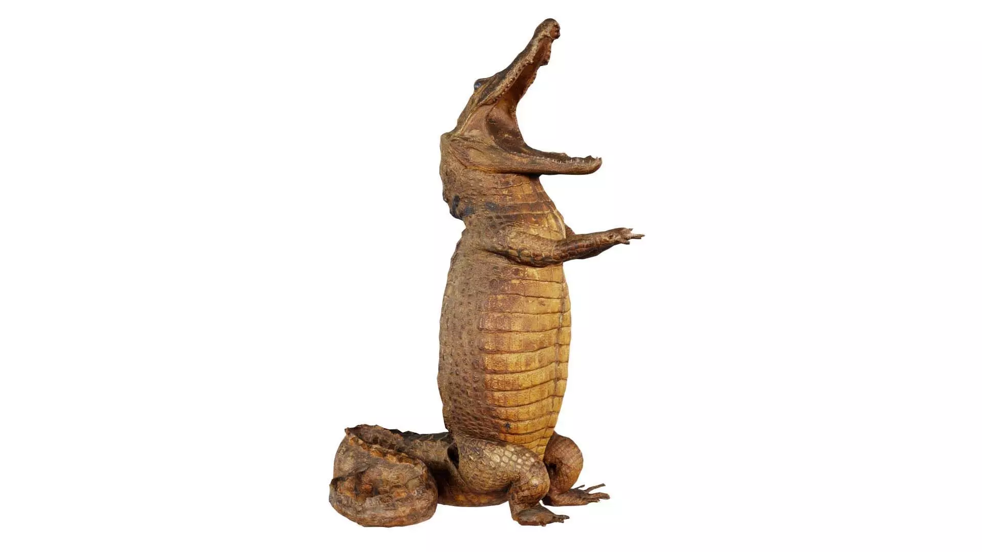 3D scanned model featuring 3d model of a crocodile statue. This model, crocodile stand, has been created using photogrammetry from a real world object.The raw scan data has been cleaned, retopologized and UV-unwrapped using Zbrush. The result is a low poly mesh with baked maps. The .obj and .mtl are configured so that maps will load automatically in the shader (tested in Blender). In addition, a Blender scene is provided with the model and shader already set up for rendering and export. Detailed information below: