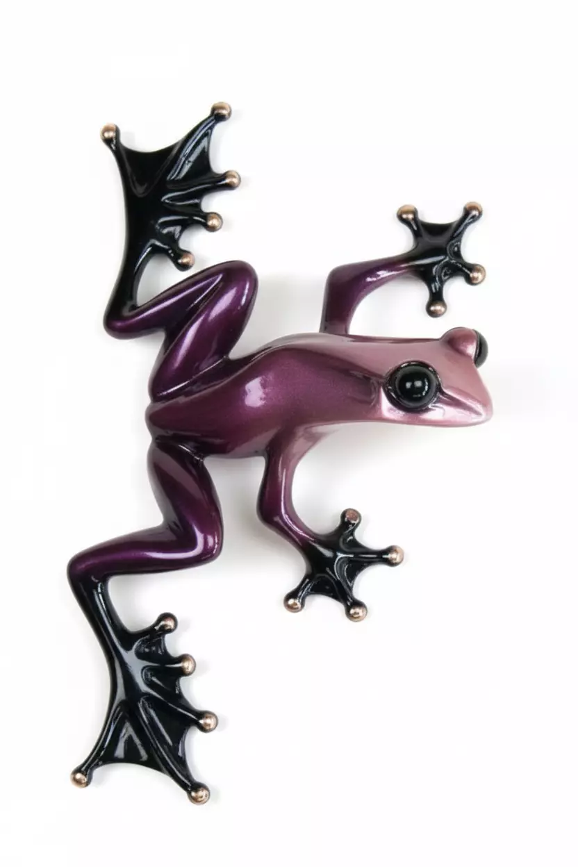 Highly detailed 3D model of a striking, artistic frog sculpture crafted in glossy metallic finish, designed for decorative wall art or interior design applications. The frog is depicted in a dynamic climbing pose, with limbs splayed outward and toes extended, each ending in small, spherical suction-like pads that add both realism and visual interest. The body features a rich gradient of deep purple to burgundy tones, with a highly reflective, polished surface that captures light beautifully, creating a luxurious and almost surreal appearance. The contrast between the vibrant body and the dark, almost black limbs enhances its dramatic silhouette, making it a captivating focal point.
