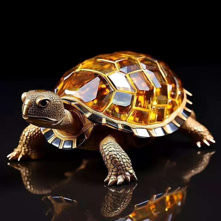 The centerpiece is a dramatically stylized turtle rendered in polished gold and deep amber resin, its form captured in a poised, grounded stance that evokes the quiet dignity and alert presence of a royal guardian. The entire surface is lavishly adorned with thousands of micro-set round brilliant-cut diamonds, creating a dazzling cascade of light across the shell that mimics sunlight glinting off gilded surfaces in a palace hall. The diamonds are precisely calibrated to reflect light uniformly, producing a shimmering effect that enhances the statue’s luminosity and reinforces its status as a jewel of the crown.