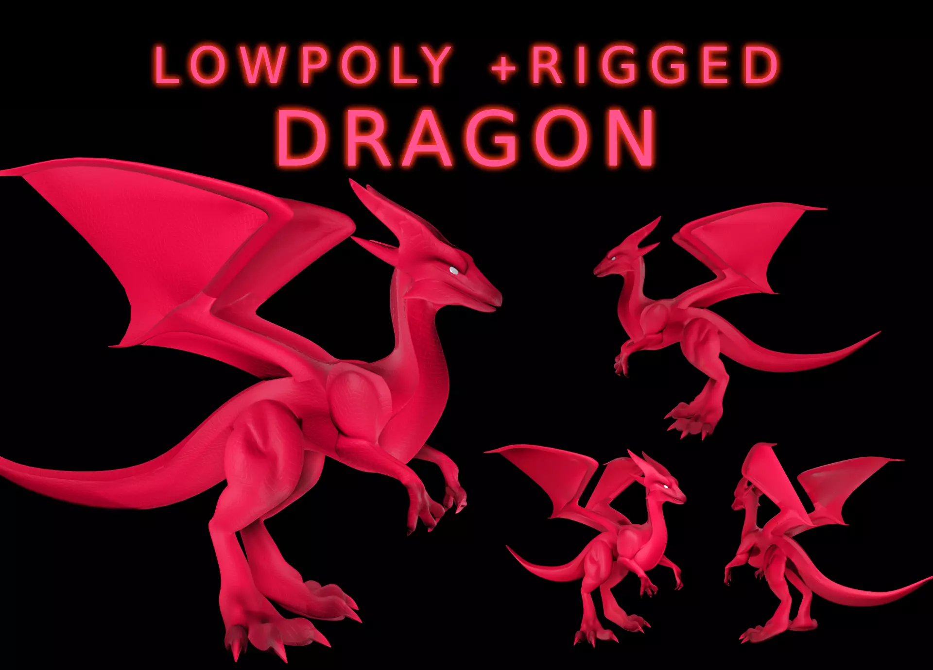 Rigged, lowpoly dragon model, available in triangulated and nontriangulated formats. Model file is subdivision ready; textured turntable preview images are of the model with two levels of subdivision applied. Also included in the preview images are the non-subdivided model with visible wireframe. Sculpted in Blender, UV unwrapped. (Also available for purchase in 3D printable formats, prepared for 3D printing with standard 3D printers). Model includes four scale texture maps: displacement, gloss, normal, and reflect.