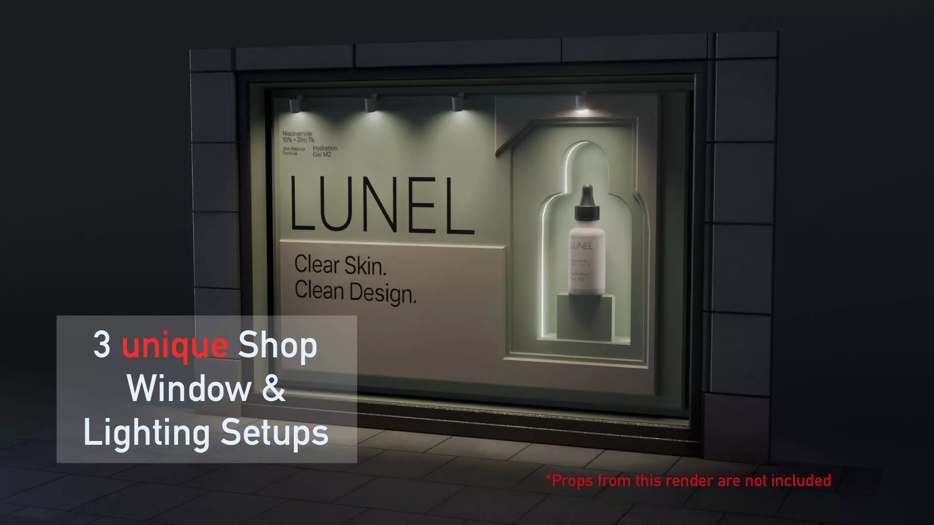 High-quality, ready-to-render shop window assets designed for professional architectural visualization. This pack includes 3 unique window designs with pre-configured lighting for both day and night scenarios.