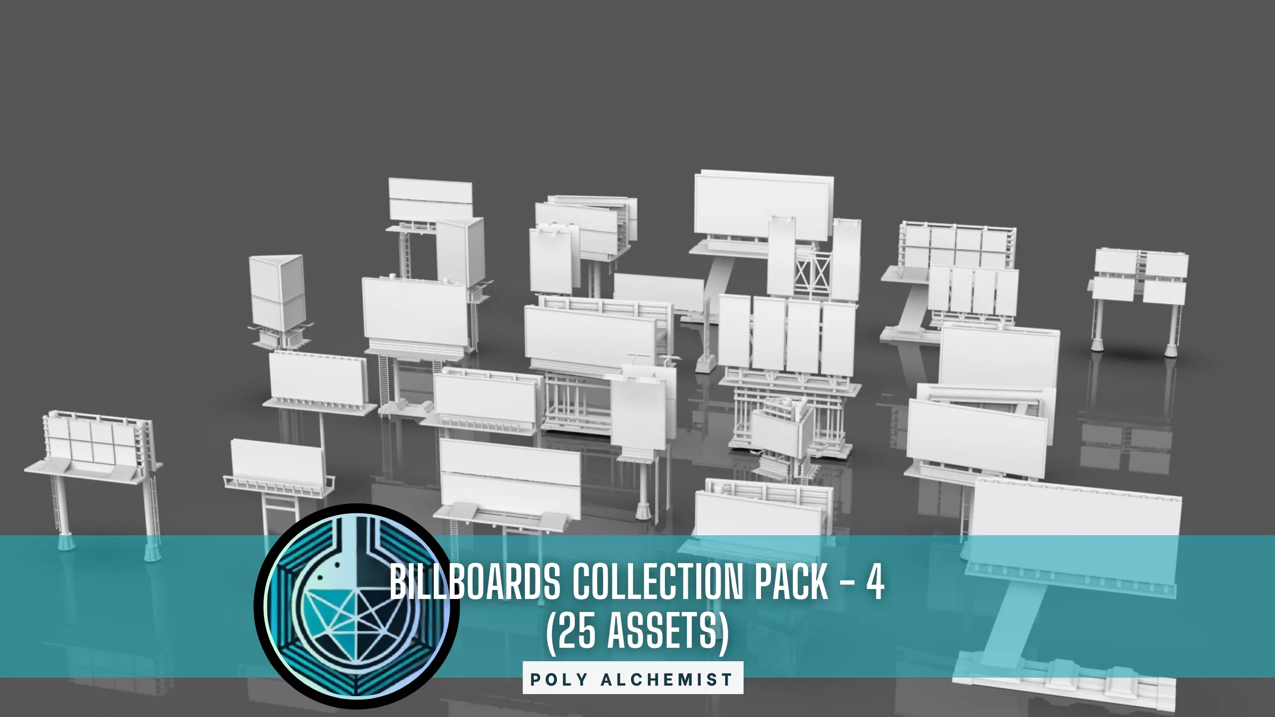 A collection of different BIllboards and Advertisement boards of different desigsn. Pack - 4 containing 25 different assets. Perfect for whiteboxing, concepting or kitbashing.