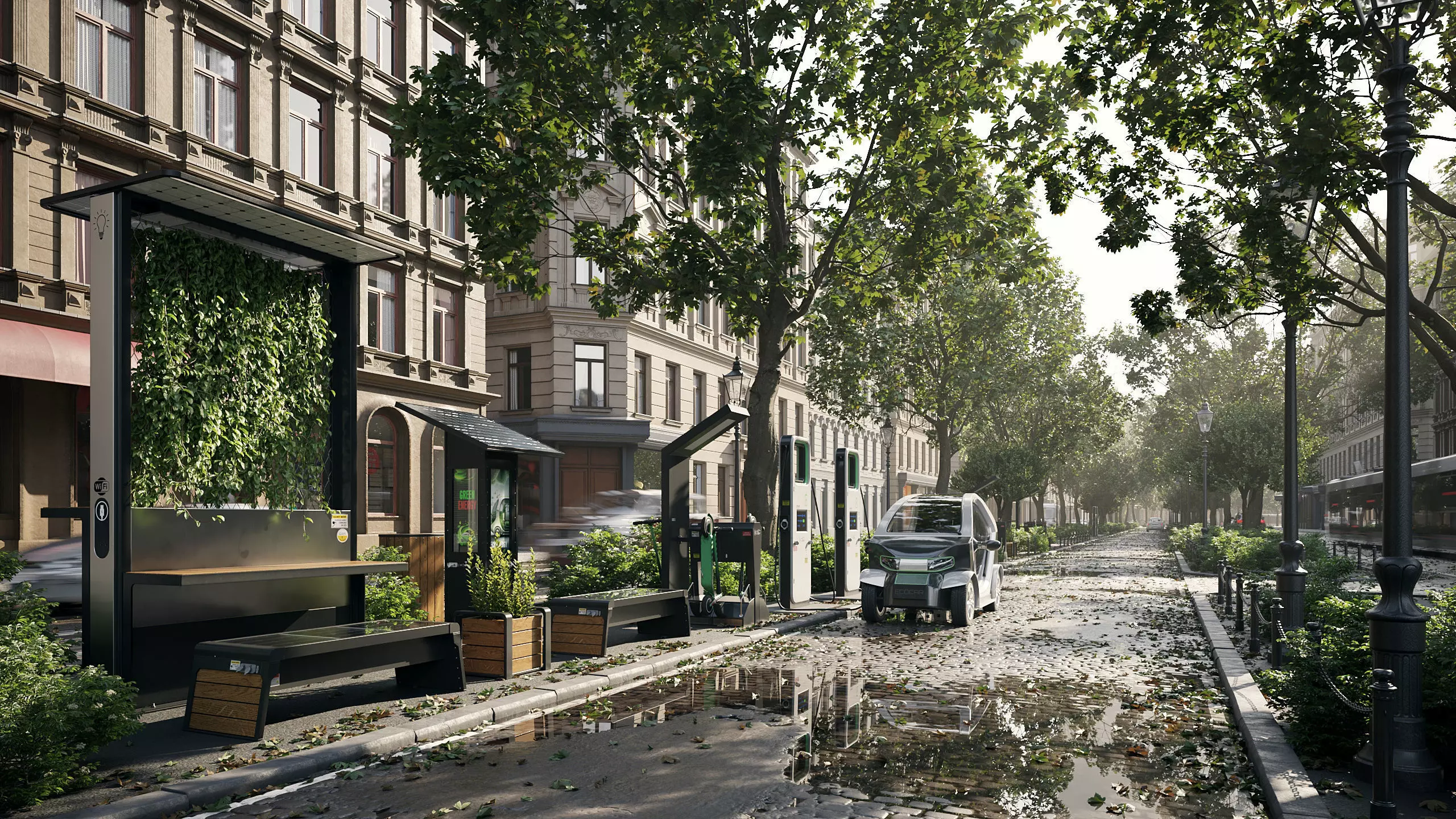 Archmodels vol. 285 is a collection of 85 models combined in 12 sets of urban infrastructure models based on the technology of ecological renewable energy sources. You will find models such as electric vehicles, photovoltaic benches, charging stations and solar inverters with solar panels. Additionally, the sets have been enriched with elements of urban greenery to fit into the modern, ecological urban environment. The models are consistent in material terms and can be combined with each other. The materials were prepared in the PBR metallic/roughness system and are based on individual maps.