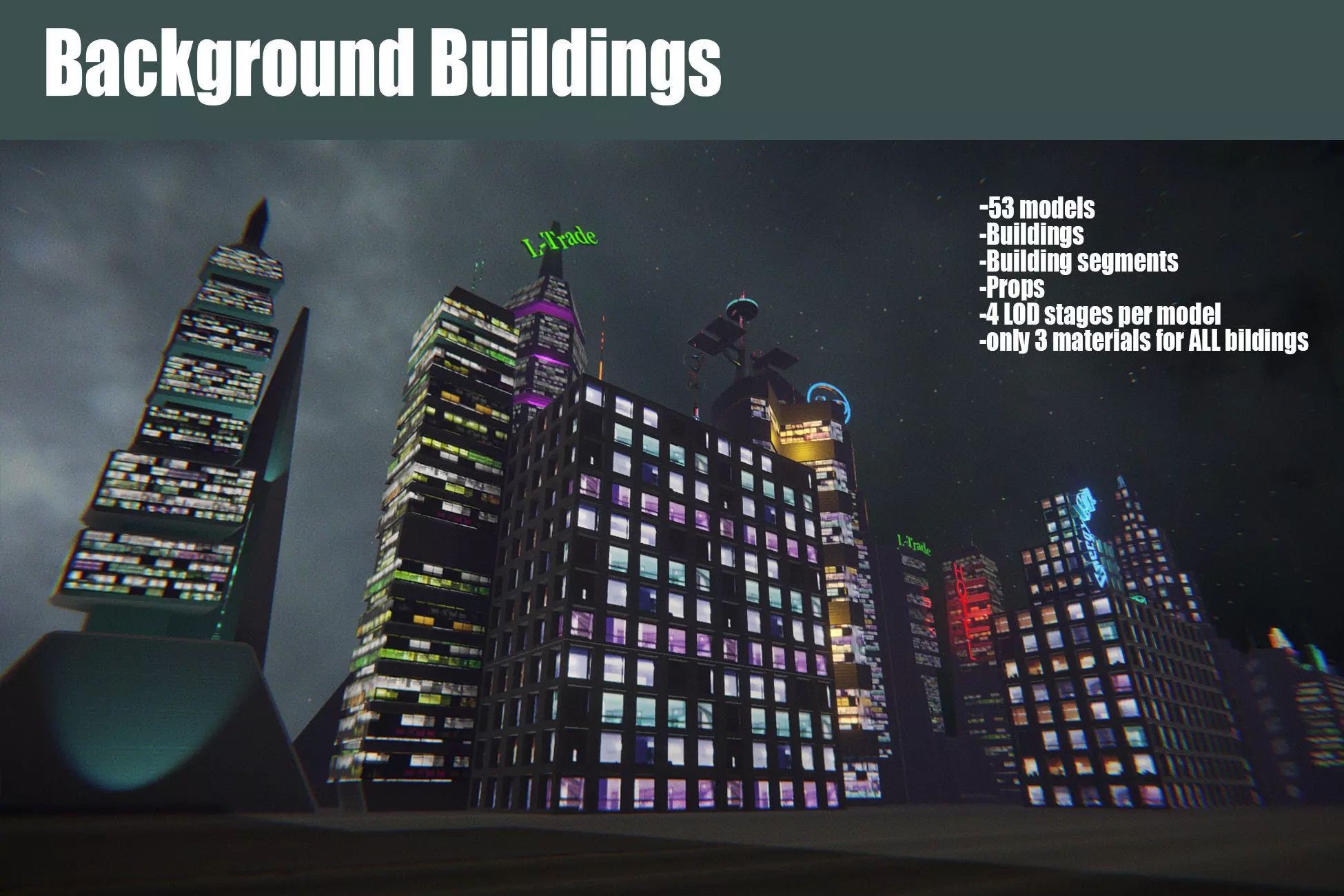 Model pack with 53 models to populate your city scenes. This semi-modular pack you can use mainly like background, because of very low poly count and only 3 materials per model.