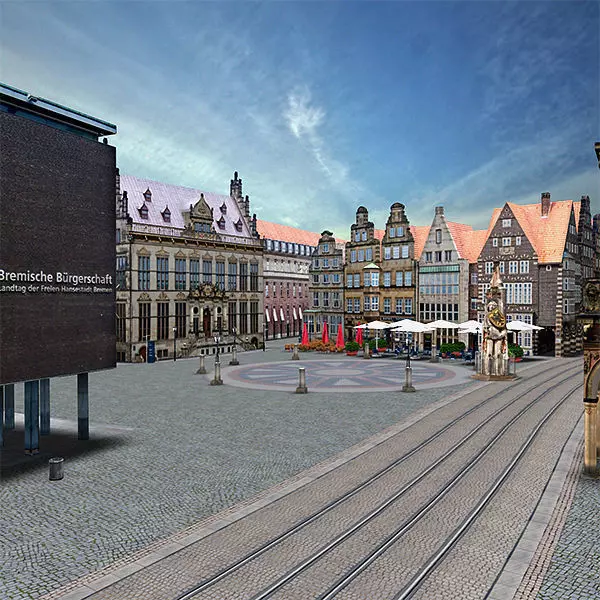 A model of Bremen old city centre. More texture- as 3D work. Its no 3D scan - everything is modelled manually. Simple lowpoly geometries with high resolution textures. Textures are taken on location in Bremen (germany) und are up to 4K resolution. All of them are retouched to fit to each other (especially on the ground). Made for a car presentation environment (on the circle on the ground), but never finished up tp 100%.