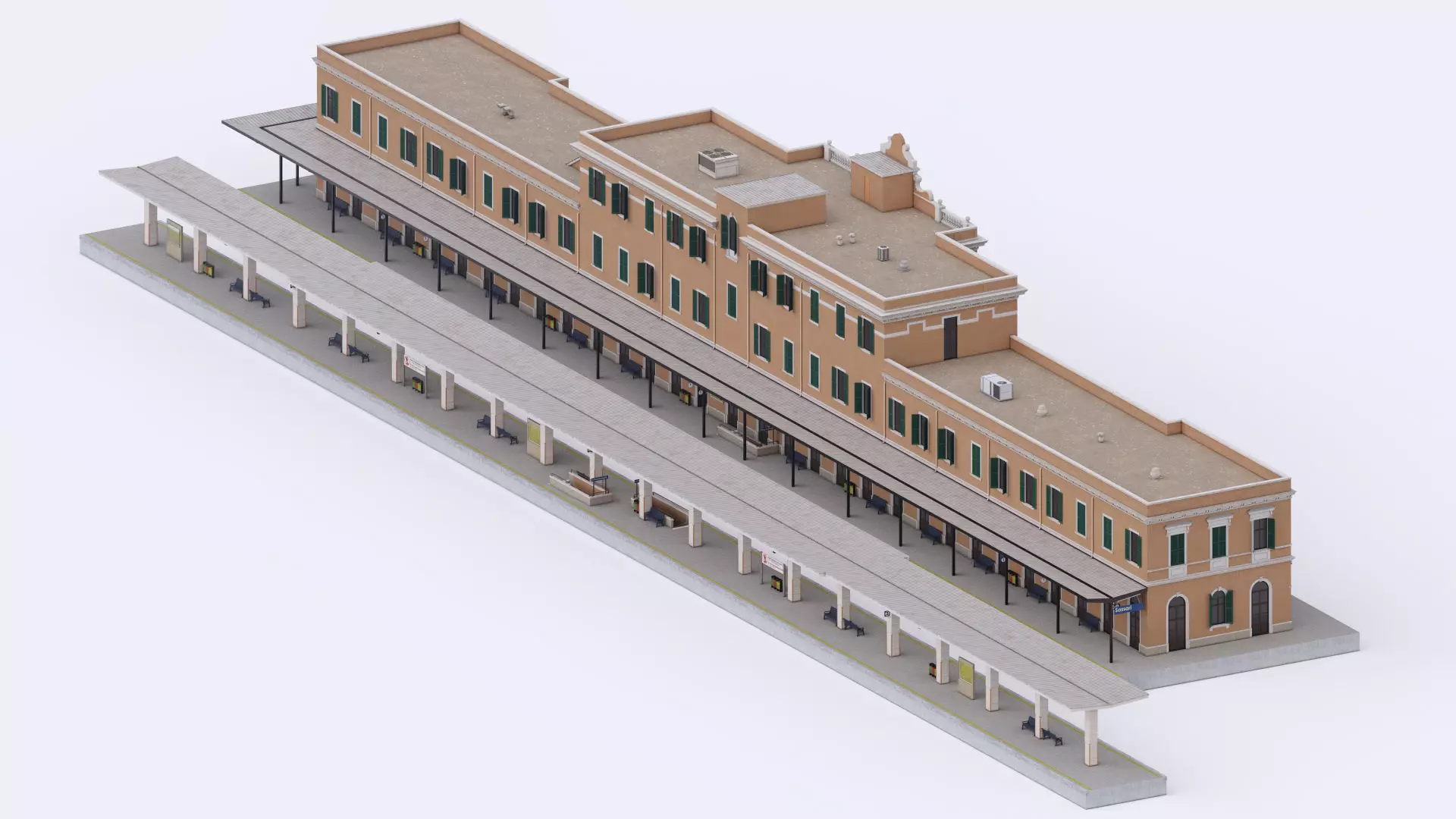 A mid-size classical style train station. In real life it's located in the 2nd largest town of the Italian island of Sardinia - Sassari. The model thus has a signage for that city and Italian Railway Company. Somewhat altered and modified but in great measure reflects the real-life object.