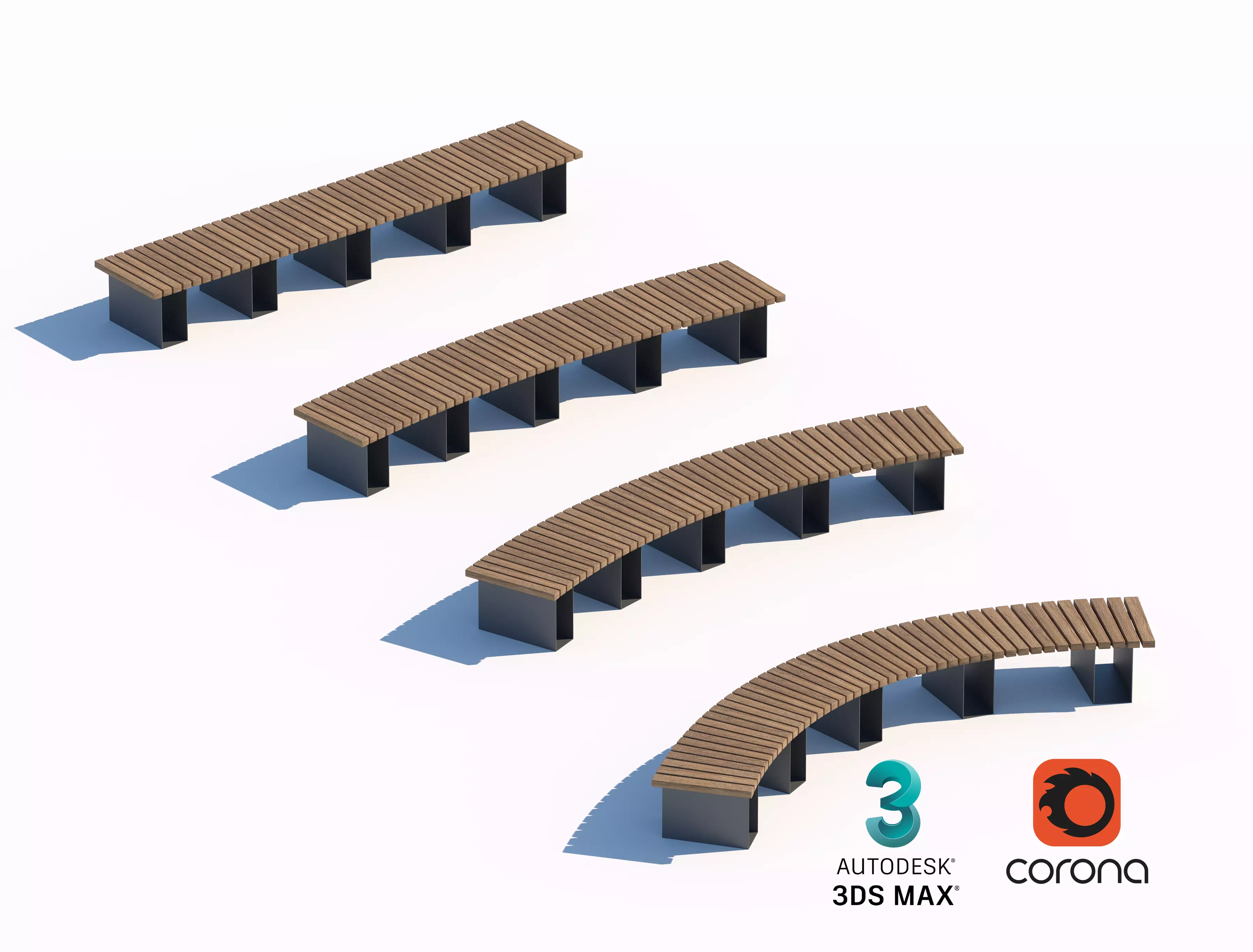 A versatile set of curved and straight wooden benches with a modern aesthetic, ideal for parks, urban spaces, and outdoor environments. Durable materials and modular design make it perfect for various layouts.