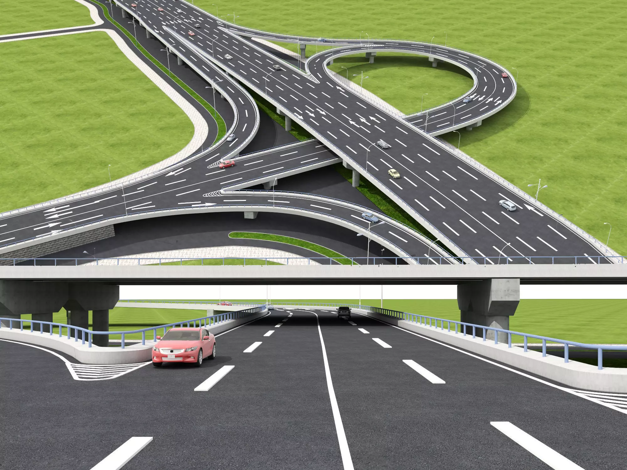 A highly detailed, multi-layered highway interchange 3D model, designed for urban visualization, architectural rendering, traffic simulation, and gaming environments.