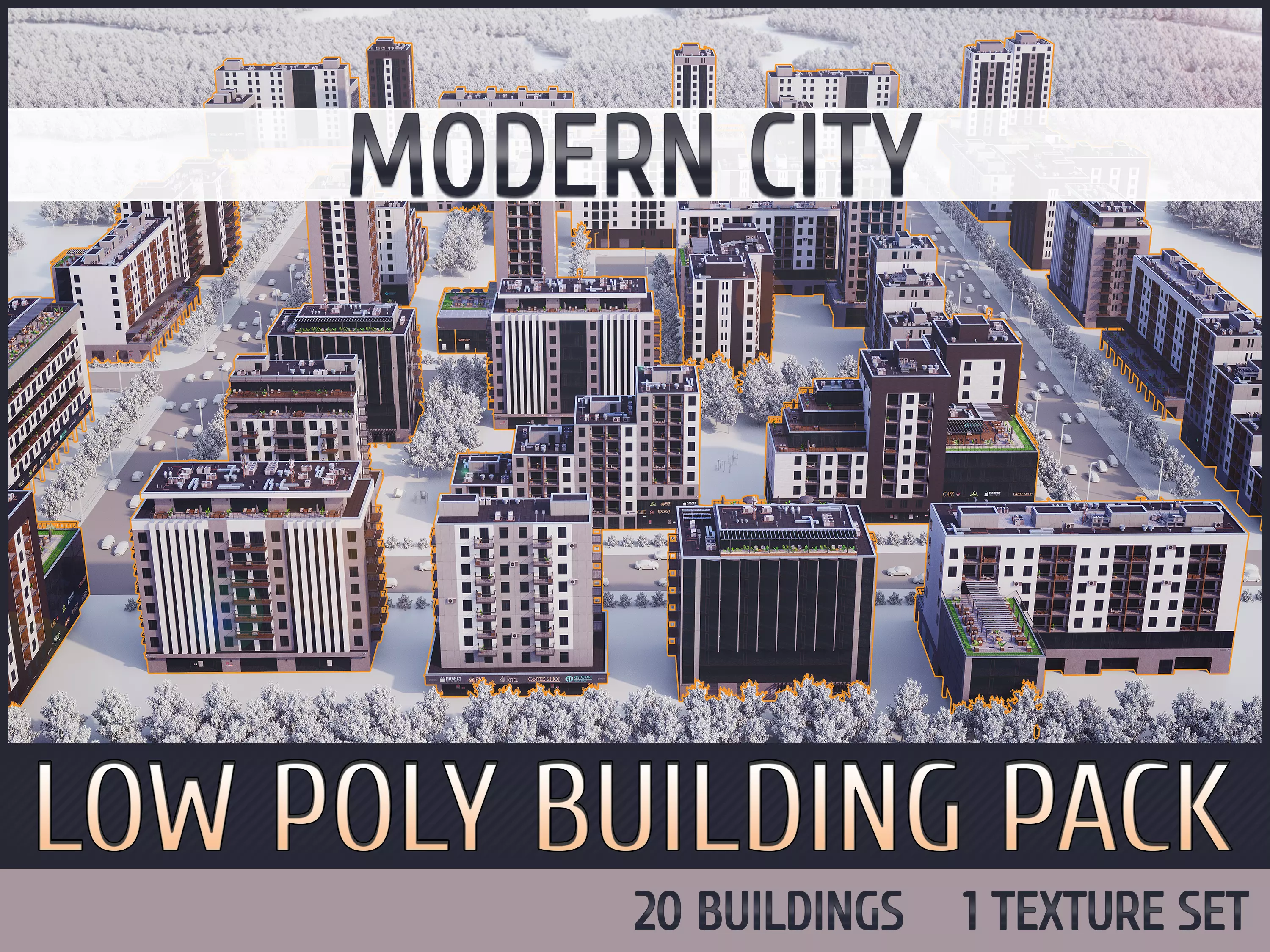 PBR lowpoly buildings in a modern style, which are perfect for background in architectural visualization and gamedev, fly-through animations, cityscape or city creating.