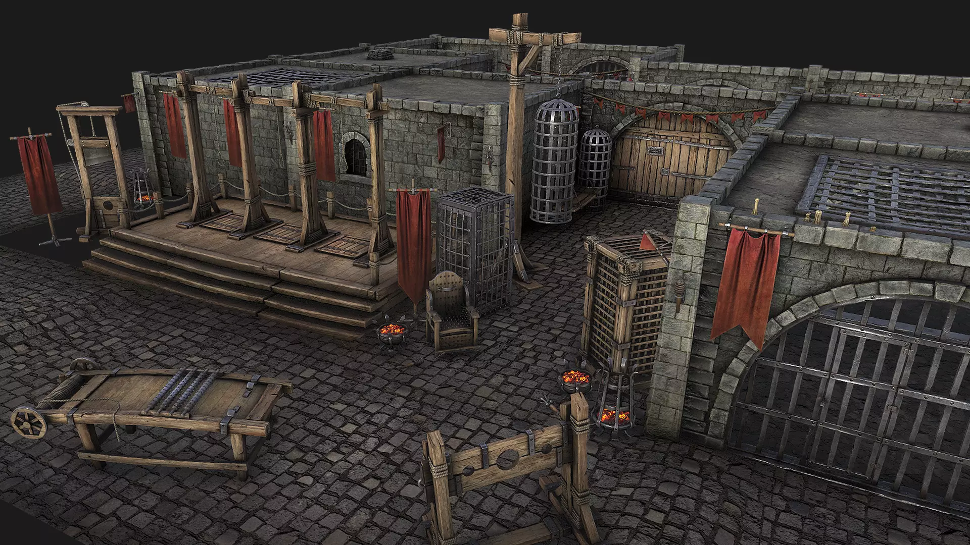 Game ready models .The model contains lods, detailed information on the images.Stylized and detailed Medieval Torture Prison Constructor Pack fully textured, sculpted and rendered with Physical based rendering (PBR) - Shown images have been rendered in Marmoset Toolbag . The set contains the following models:Guillotine,Gallows with Podium ,Pillory,Rack,Hanging Cage,Woden Cage,Steel Cage,Torture Chair. The set also contains of 17 unique meshes for assembly, which includes the following models: prison bed, 2 walls, wall with window, wall with archway, wall with prison bars, wall with wooden entrance, steel door, wooden door, column,roof, grate roof, ventilation pipe roof, 2 prison Structures,stone prison floor,stone paving,Lamp with candles,Large brazier,Small brazier,Candles,wooden torch,wooden torch with mount,Castle torch with mount,Castle torch, set containing 15 flag models(Flags have 13 color options),