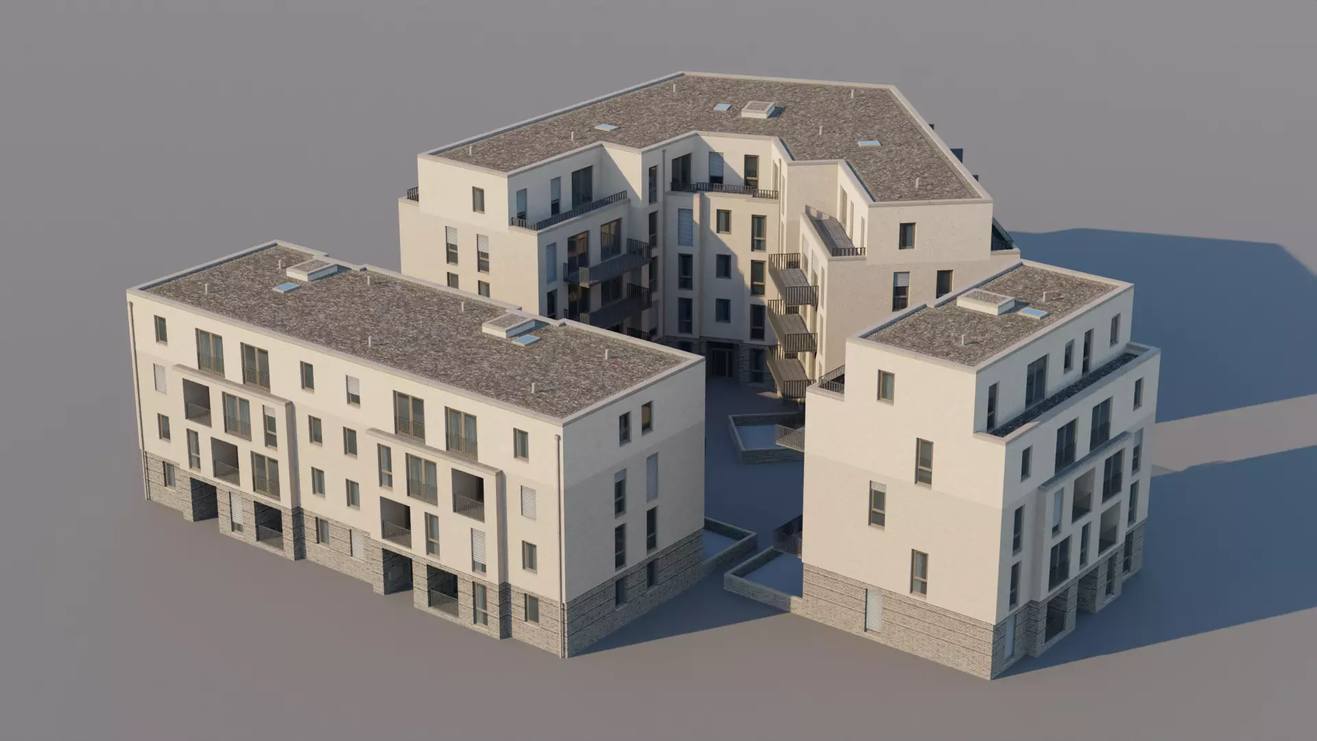 Set of 3 modern apartment buildings in a generic European style, ready to be recoloured and arranged for personal use.