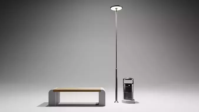 This is a high-quality modern urban street furniture set consisting of a bench, lamp post, and trash bin.The models are designed with a clean, minimalist aesthetic and are intended for architectural visualization, cinematic renders, and concept design.