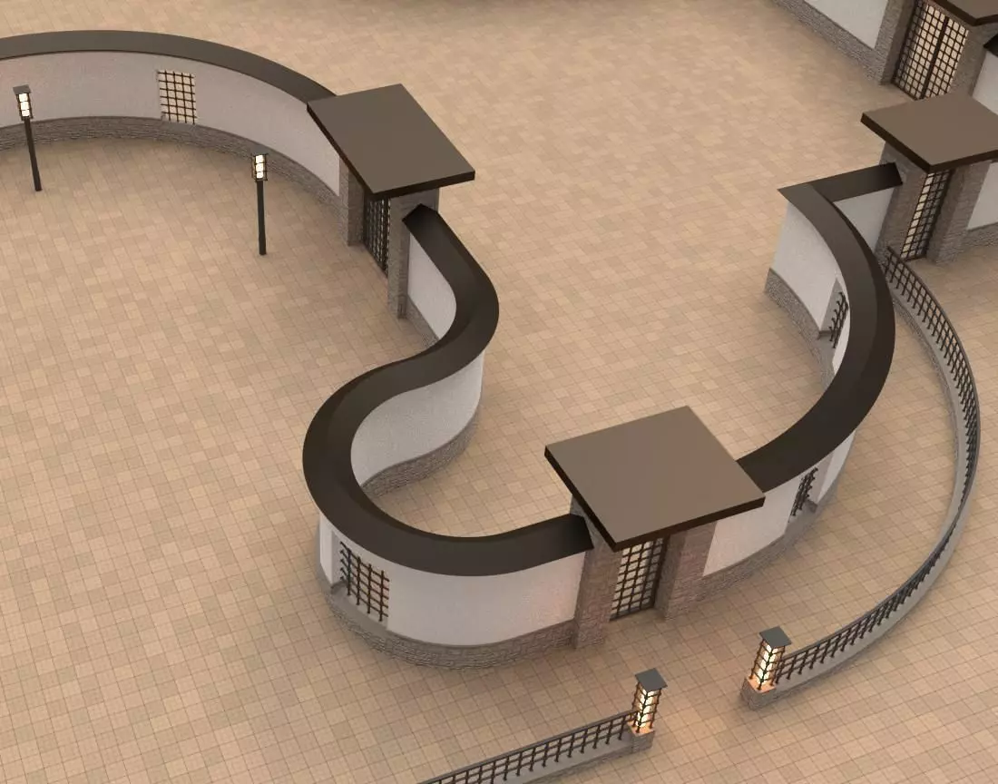Two different radius of circles are provided, with plain walls and barred windows walls. And a extra bigger radius circle of lower fences. Straight walls in two different models with and without barred windows. Three sizes doors and gates. Different pillars. Post lamps.