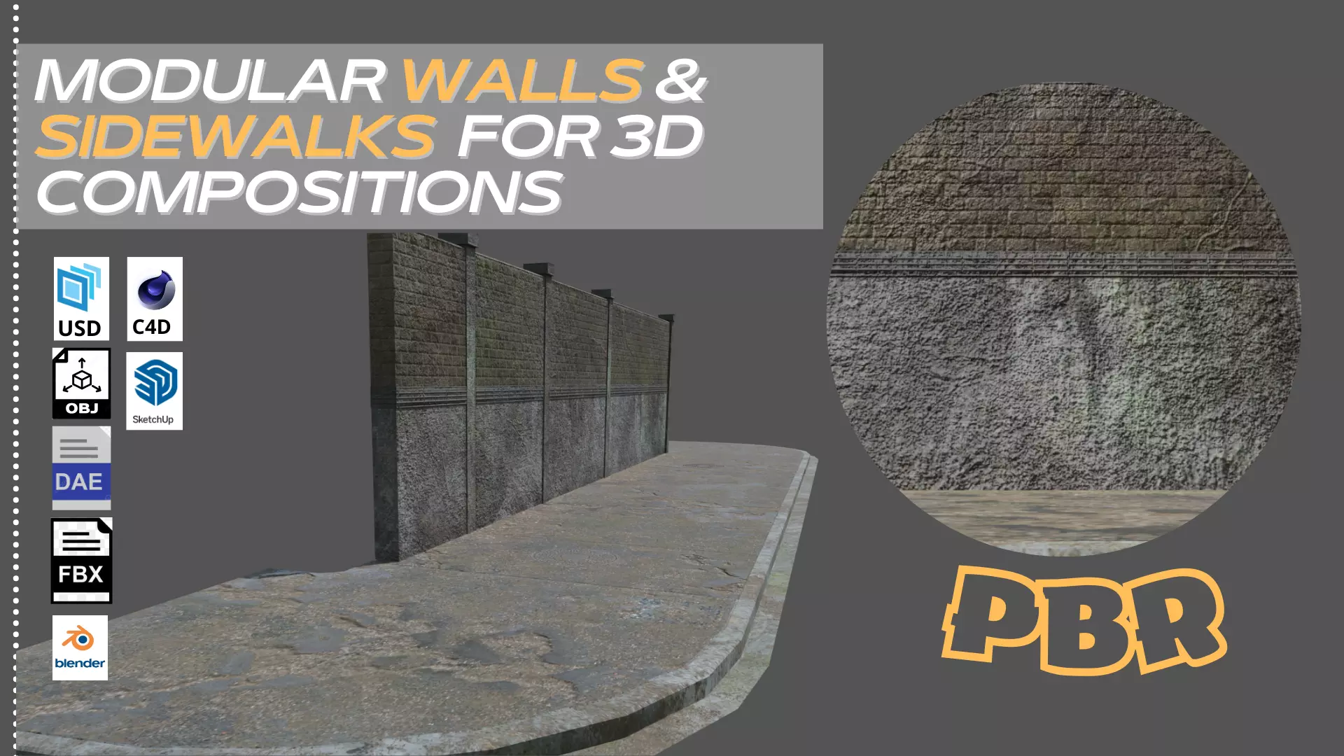 Elevate Your 3D Projects with Optimized Modular Walls and Sidewalks!Craft stunning and realistic 3D scenes in record time with this comprehensive collection of Optimized Modular Walls and Sidewalks!Perfect for:3D artists seeking to save time and enhance realism in their projects without compromising quality.Game developers desiring detailed and customizable urban environments with minimal performance impact.Architects and designers needing to visualize their projects with precision and realism on less powerful computers.This bundle includes:High-quality 3D models in real-world dimensions, optimized for low polygon density.Seamlessly interlocking modular pieces, enabling the creation of endless variations.High-resolution textures for impressive realism, even on low polygon models.Compatible formats with Blender, OBJ, FBX, DAE, C4D, SKP, and USD.Neatly organized, grouped, and named models for ease of use.Save time, effort, and computational resources with this complete set and start crafting incredible 3D scenes today!Important Notes:The scene in C4D (cinema4d) and SKETCHUP is not configured for lighting and rendering. You need to insert the texture path into the attached folder.This bundle includes 3D models only. Scene objects and lighting are not included.Don't miss out! Grab this collection now and elevate your 3D projects to new heights, with maximum performance!Take advantage of our special limited-time offer!Any questions? Contact us!We're always here to help.Buy now and start creating amazing 3D scenes today!