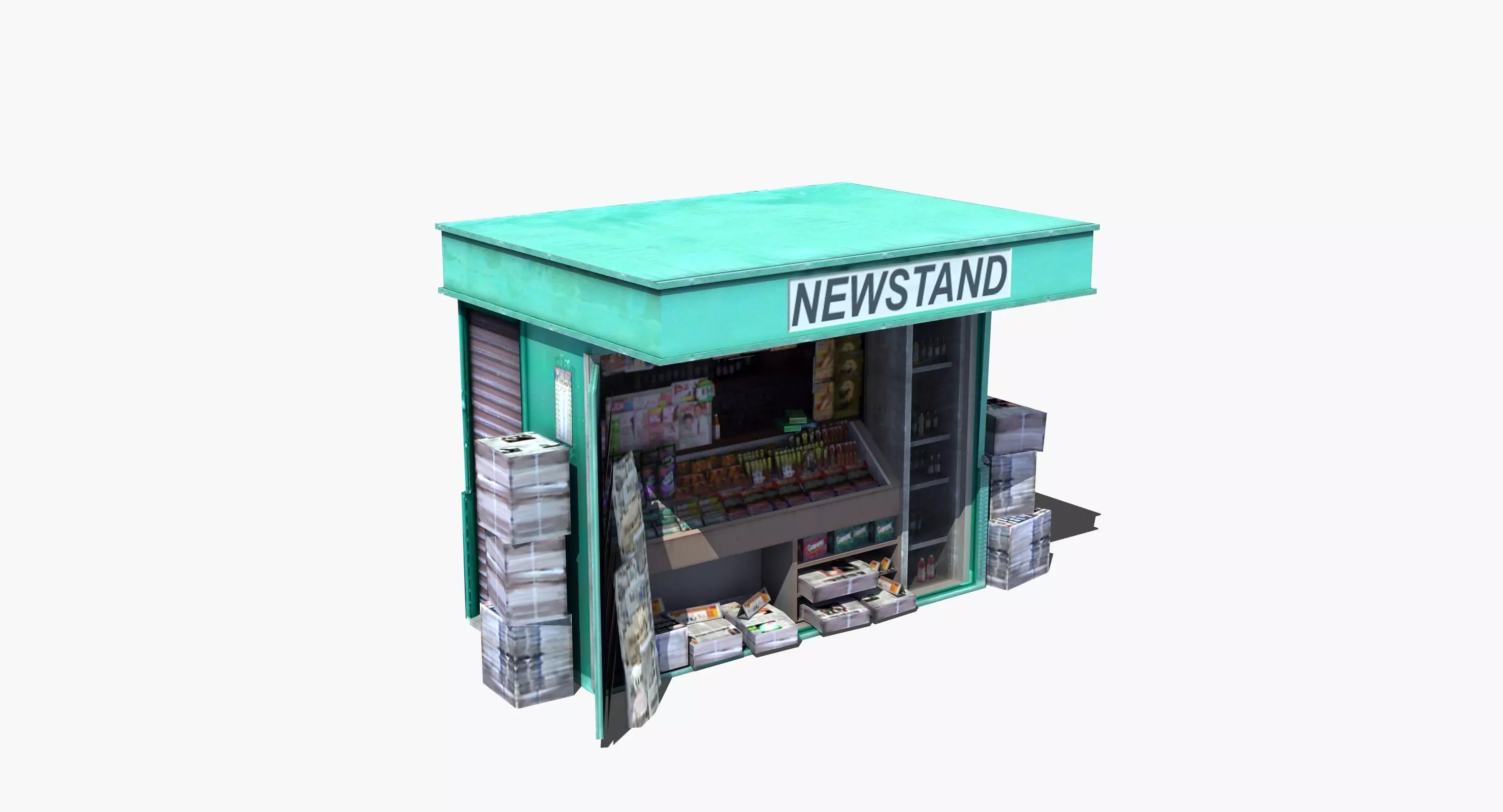 Newstand booth or kiosk, as found on a downtown city street corner. Model uses a single 2048 square color map texture page, with alpha channel. Great multipurpose 3D model (ideal for offline rendering or real time uses such as games or simulation).