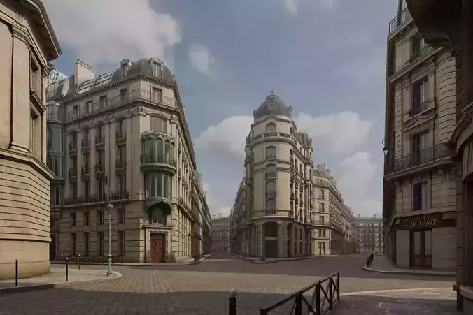Detailed 3D model of a Parisian Boulevard. Suitable for high resolution close-ups. Real world scale. Cameras are placed at eye level (~1.65m / ~5'5''). Scale figurines (visible in some renders) are 1.80m/5'11'' in height.