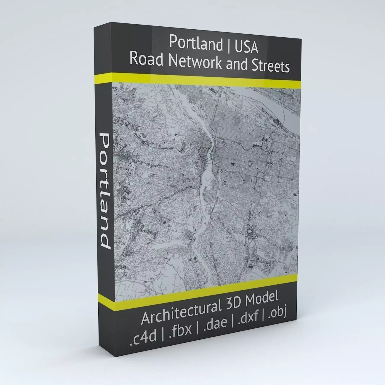 this model is based on real data therefore this is a realistic road network and streets setup of Portland, USA- 2 objects included | 1. roads and streets 2. squares and plazas- UV mapped with overlapping UVs- the model is positioned on a flat surface (road network is on the “floor” - no elevation data included)- geometry is polygonal quads and tris- model is untextured and renders fast
