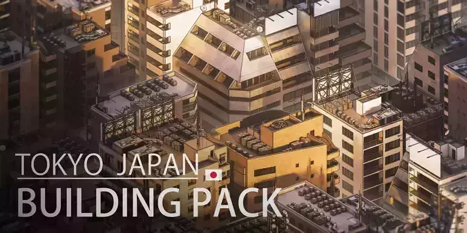 Tokyo Japan building asset pack featuring 20 buildings, 39 rooftops, 10 doors, 4 windows, and 8 stair assets. Ideal for urban scenes, and 3D environments.