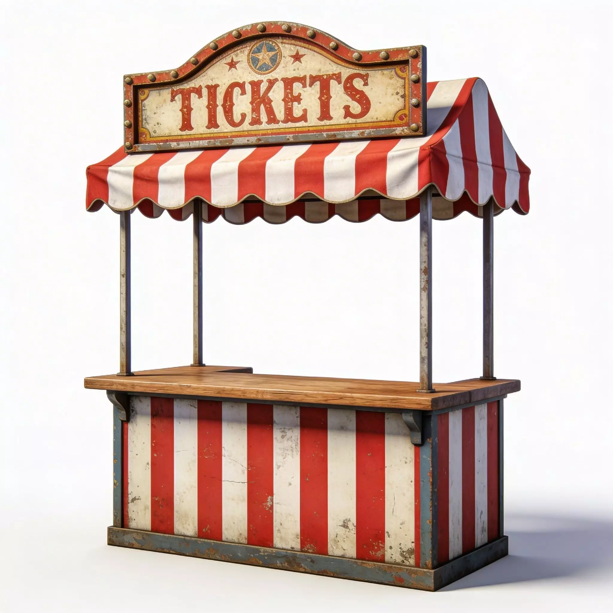 TagsTicketBooth, Circus, Carnival, 3DModel, Retro, Vintage, RedAndWhite, StripedCanopy, Fairground, GameAsset, Realistic, PBR, Weathered, WoodenCounter, Nostalgic, AmusementPark, DecorativeLights, HistoricalProp, Stylized, EnvironmentProp