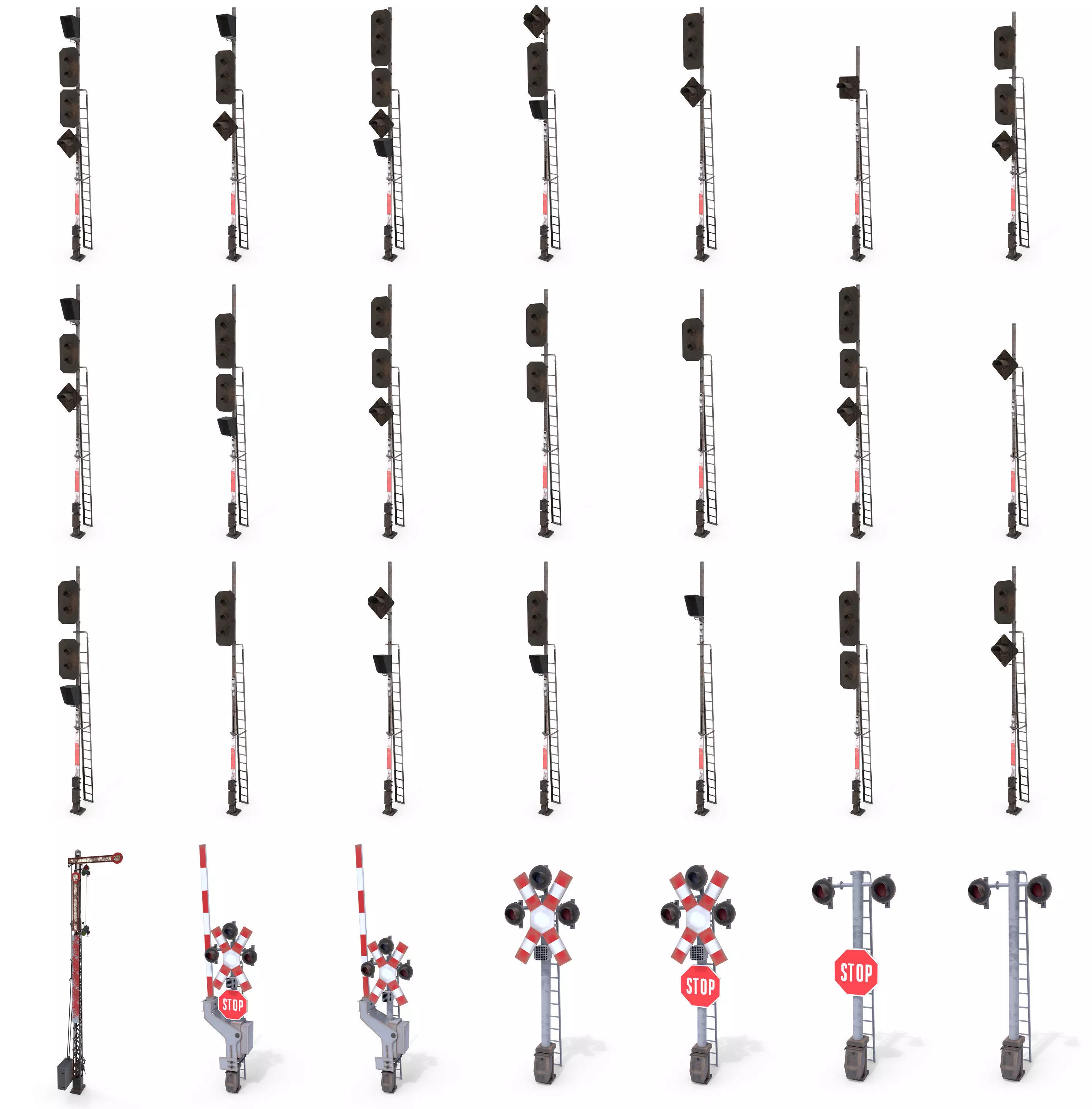 This pack contains the following:-22 Rail Crossing Traffic Light models;-6 Rail Crossing Traffic Light models;-1 Mechanical Railway Semaphore;All models are built in Blender and rendered with Cycles, with PBR materials, Game-Ready. As seen on the preview images. They come into separate file archives for convenience.The models can also be bought separately, please see my collection.