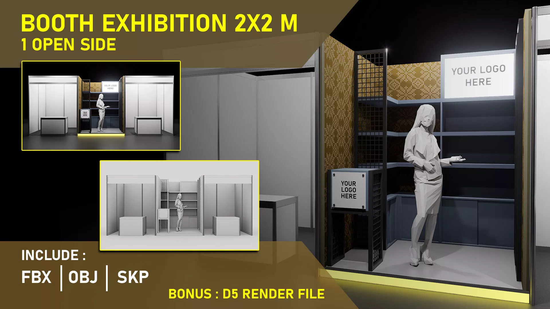 Features:Real-world scale (2x2 meters)Clean and modern exhibition booth designShowcase shelving for product displayBranding area (logo placeholder included)Optimized geometry and clean topologyReady for rendering and presentation