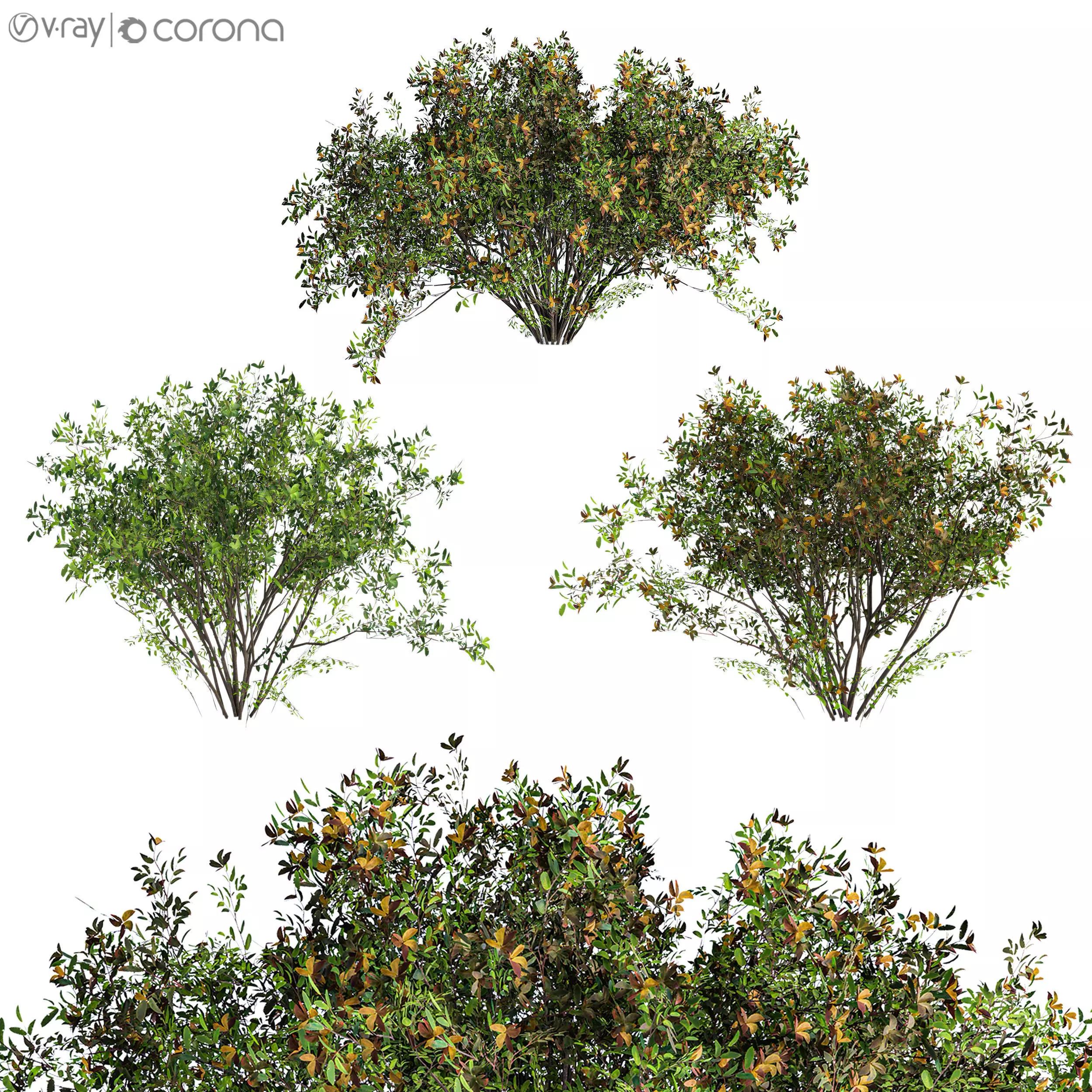 A highly detailed 3D bush model with two realistic material variations, designed for professional visualization and rendering projects. Perfect for architectural scenes, landscape design, and exterior environments.