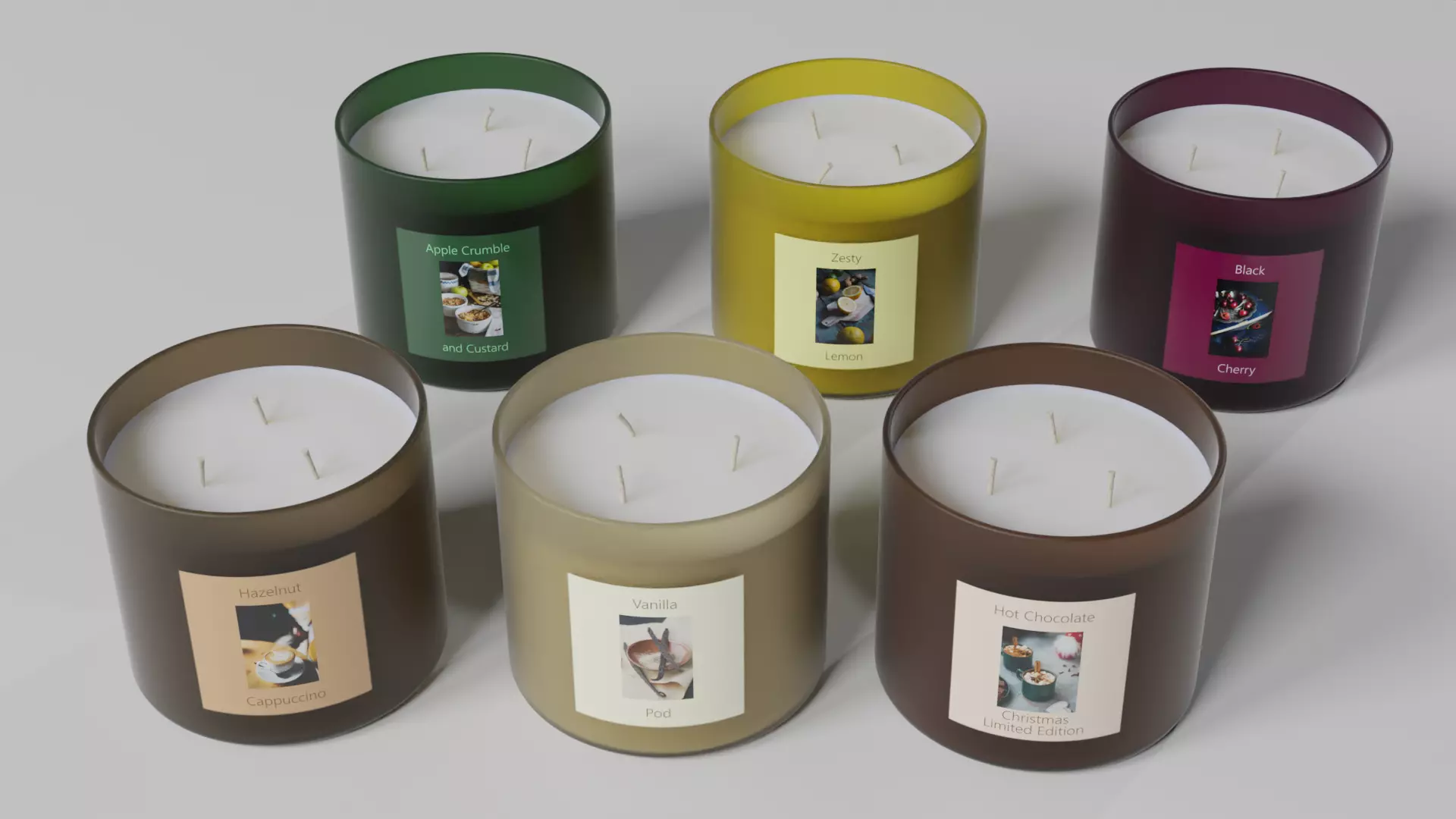 A set of six 3-Wick Jar Candles, to create a cozy atmosphere in any living space.The fragrances are Apple Crumble, Black Cherry, Hazlenut Cappuccino, Hot Chocolate, Vanilla Pod and Zesty Lemon.The candles come in coloured jars with a suitably themed picture label on the front.On the base of the jar is a label crediting the photographer of the main picture and the site the picture was found.