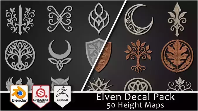 The 3DT Elven Ornamental Decal & Stamp Pack delivers 50 stylized Elven designs — crests, floral emblems, knotwork, trims, symbols, medallions, and ornamental tiles — each supplied with height, color, and mask maps, ready for Blender, Substance Painter, and beyond.