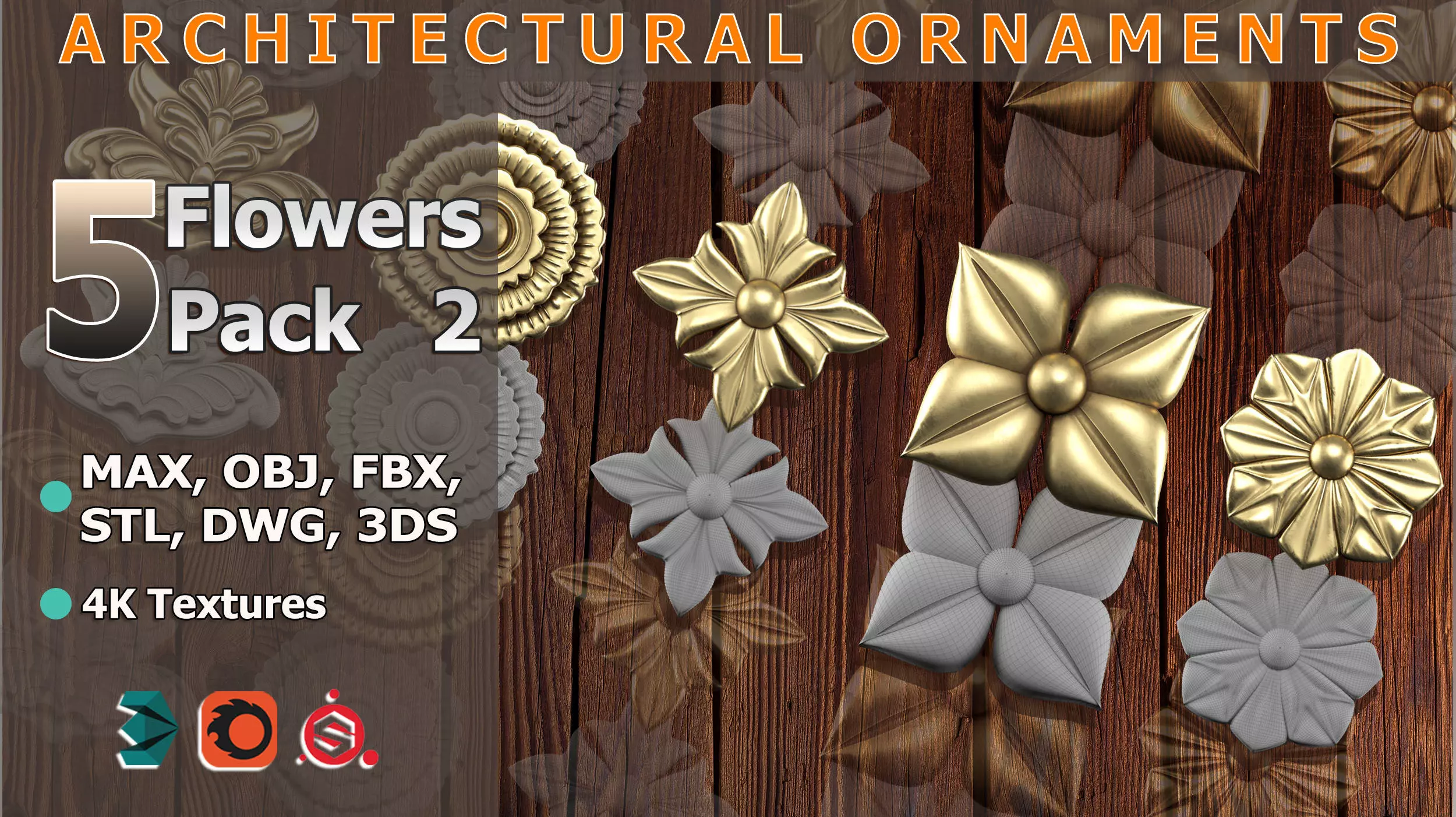 Pack of 5 new high‑quality ornamental flower models, ready‑to‑render for ArchViz, game environments, and 3D printing. Each flower features clean quad topology, 4K PBR (Specular/Glossiness) textures, and multiple file formats for seamless integration into any pipeline.