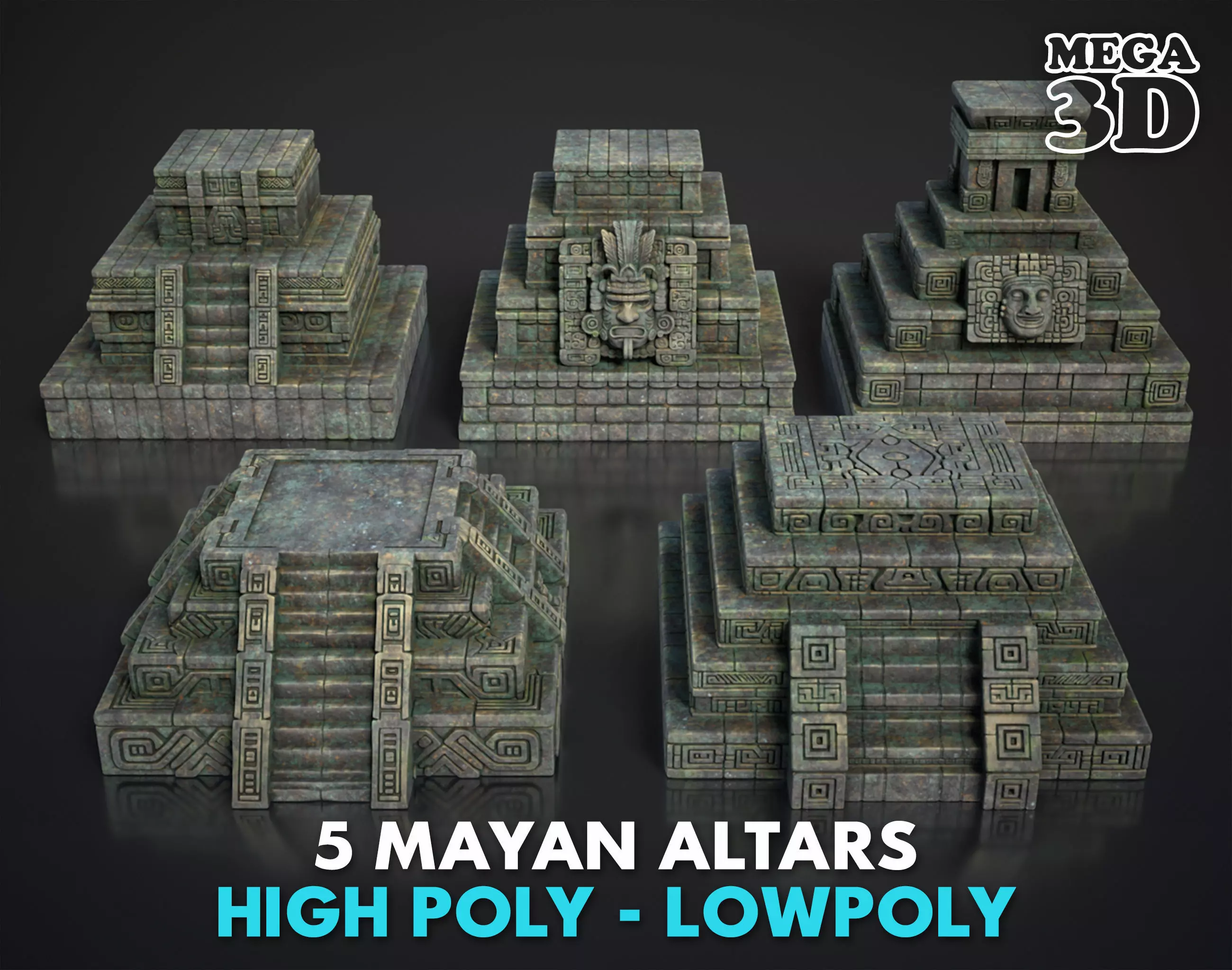 This premium 3D asset pack includes 5 unique Mayan altar styles. Every model is provided in both low poly and high poly versions, resulting in a total of 10 3D models (5 styles × 2 versions).