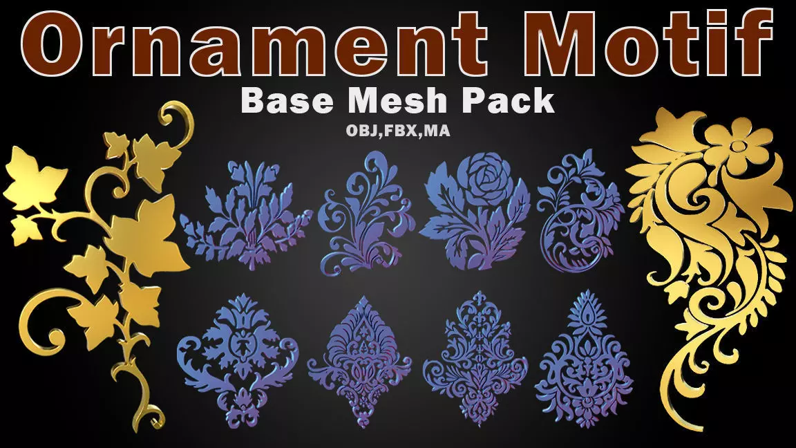 This pack includes 75 Ornaments Motif 3d models as a base mesh to add more detail in your 3d projects.