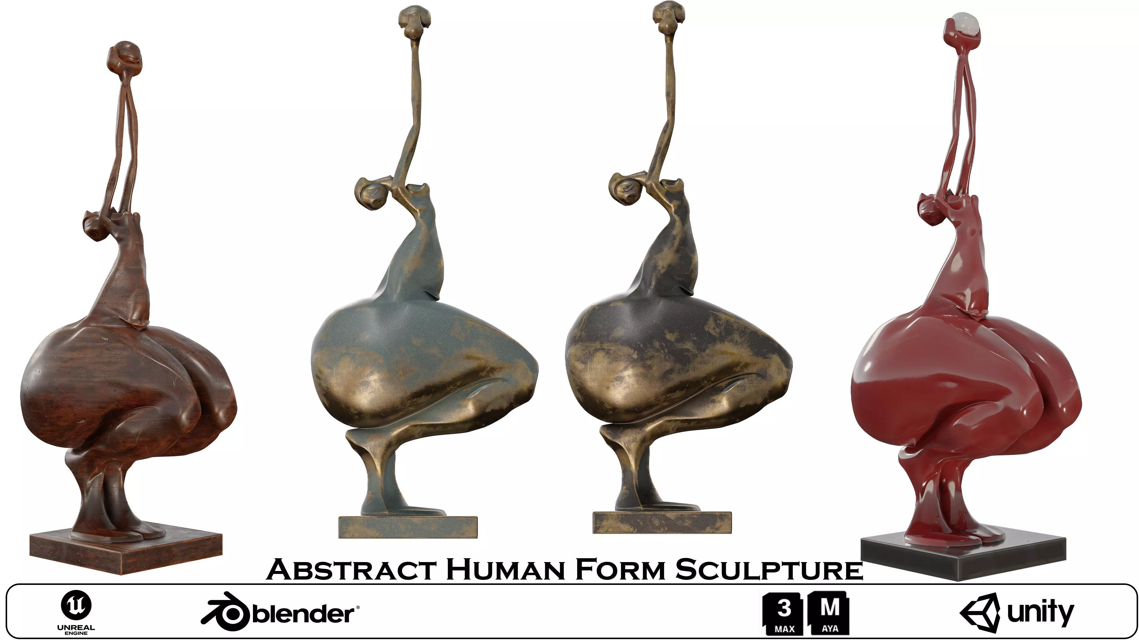 Name: Abstract Human Form SculptureType: modelFormat: 3Ds Max 2013Export: FBX, OBJRender: VRay (5.x), Corona (6)Polys: 151496Verts: 76423Matclasses: VRayMtl,CoronaMtlUnits: CentimetersDimension: 60.27 x 38.38 x 109.96Date: 2025.11.12This dynamic 3D model set features four stylized human figures, each rendered in a unique material finish including wood grain, metallic bronze, matte clay, and glossy red. The exaggerated proportions—rounded lower body, elongated limbs, and raised arm holding a spherical object—create a sense of movement, balance, and symbolic gesture. These sculptural forms are ideal for modern art galleries, conceptual design spaces, or virtual exhibitions.Each model is optimized for use in Blender, Unreal Engine, Unity, 3ds Max, and Maya. Clean topology and PBR textures ensure high-quality rendering across platforms, making this collection perfect for both artistic and architectural applications.