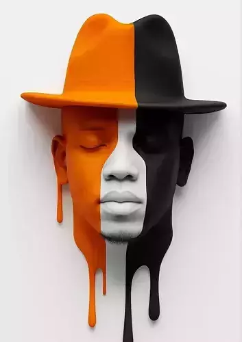 This striking 3D render showcases a bold, abstract sculpture of a human face, split vertically into two contrasting halves — one side rendered in vibrant, glossy orange, the other in deep, matte black. The face is topped with a wide-brimmed fedora hat, also divided down the center, mirroring the duality of the face beneath. The sculpture’s most arresting feature is the illusion of dripping paint: thick, viscous streams of orange and black material appear to flow downward from the eyes, cheeks, and chin, pooling at the base as if melting or dissolving — creating a powerful visual metaphor for identity, emotion, or transformation.