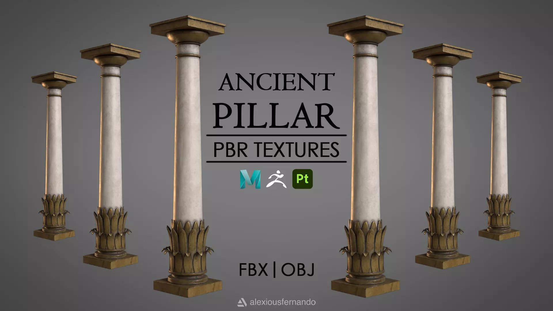 Ancient Pillar: Base modeled in Autodesk Maya, sculpted in ZBrush, textured in Substance Painter.
