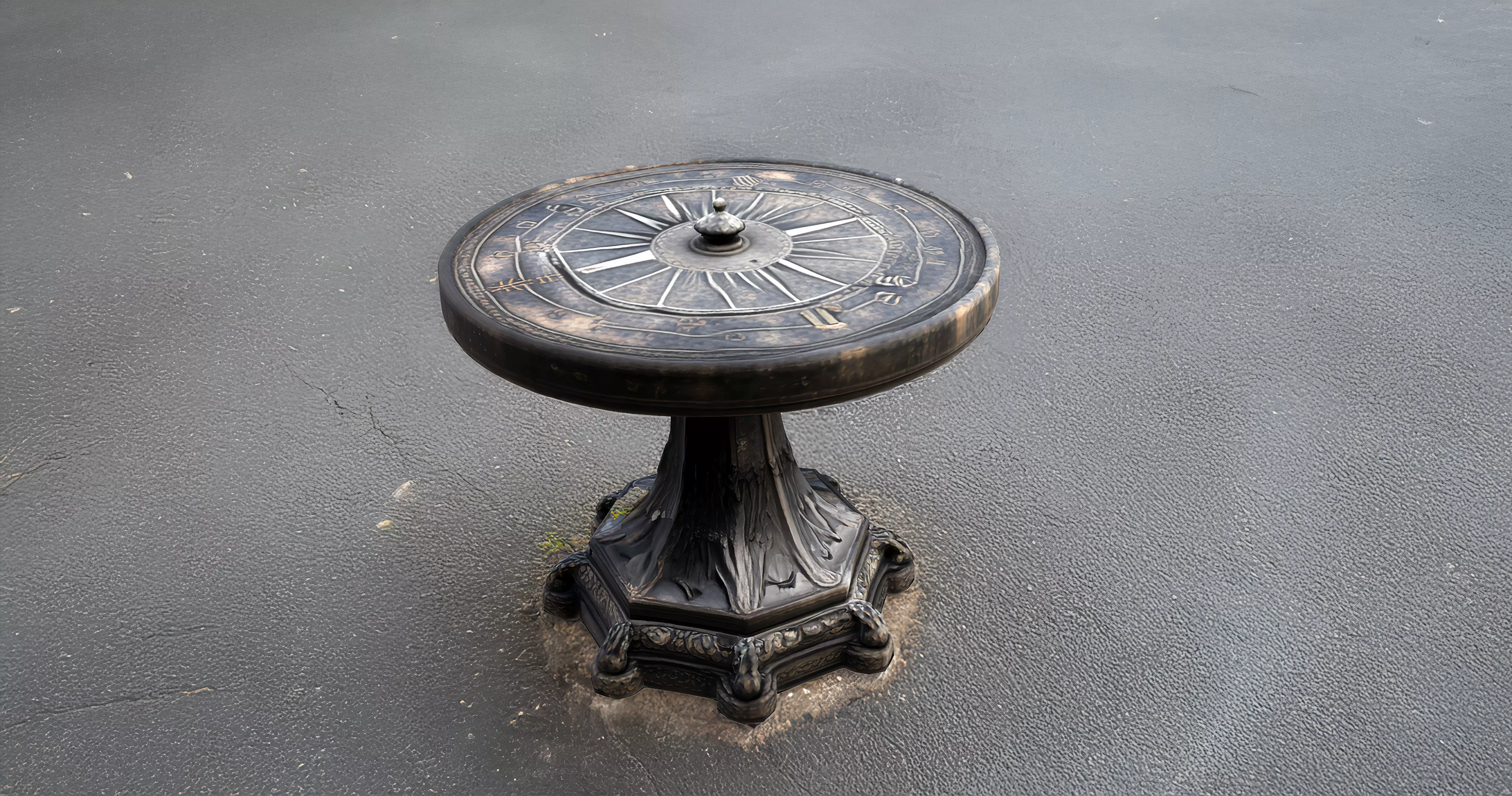 This highly detailed 3D model features an ancient sundial with intricate engravings and a weathered, metallic finish. The circular dial is adorned with Roman numerals and radial hour markings, centering around a finely crafted gnomon that casts shadows to indicate time. The surface exhibits a beautifully aged patina, giving it a realistic historical aesthetic. The base of the sundial is designed with elaborate carvings resembling flowing drapery and floral motifs, set upon a sturdy, octagonal foundation that enhances its structural elegance.