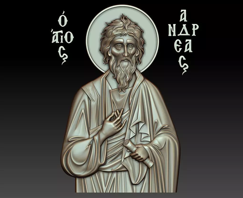 3d model Orthodox icon of Andrew the Apostle (Saint Andrew, the First-Called, Apostle Andreas). For milling on CNC machines. Can be used in the production of souvenirs, furniture, jewelry. Files in stl format, for import to artcam, rhinoceros, 3ds max, etc. You can scale the model to any size you need.