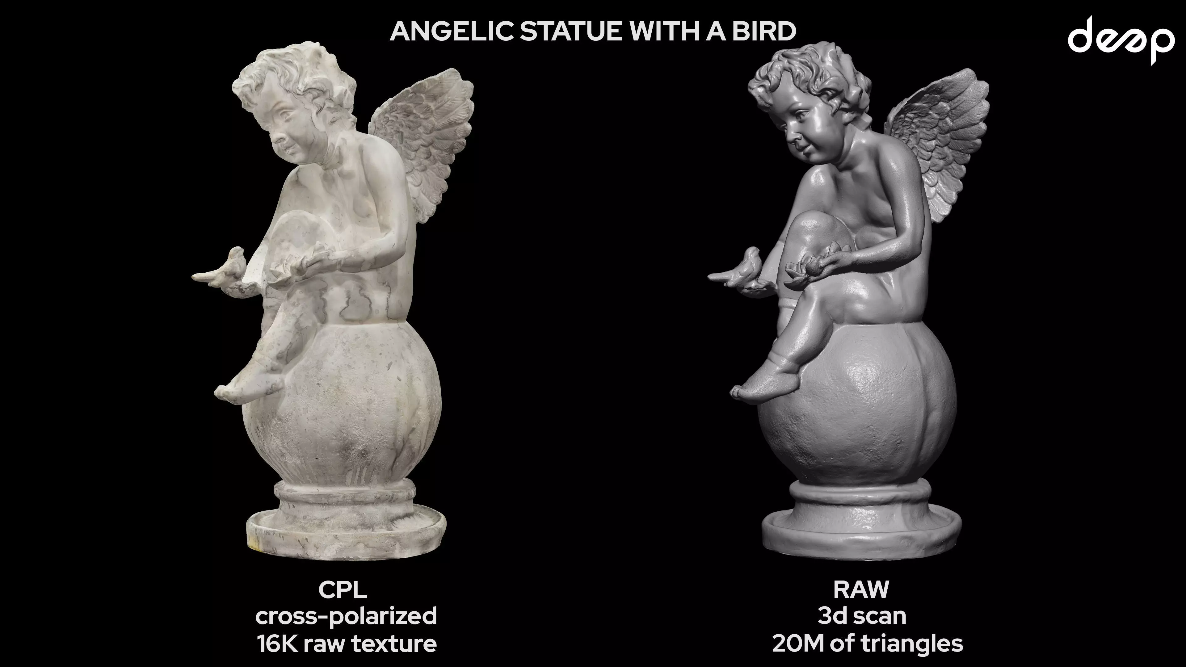 deep3dstudio is excited to present a new high-end photorealistic 3D scanned sculpture — a detailed marble angel statue with a bird, captured using a cross-polarised photogrammetry system.
