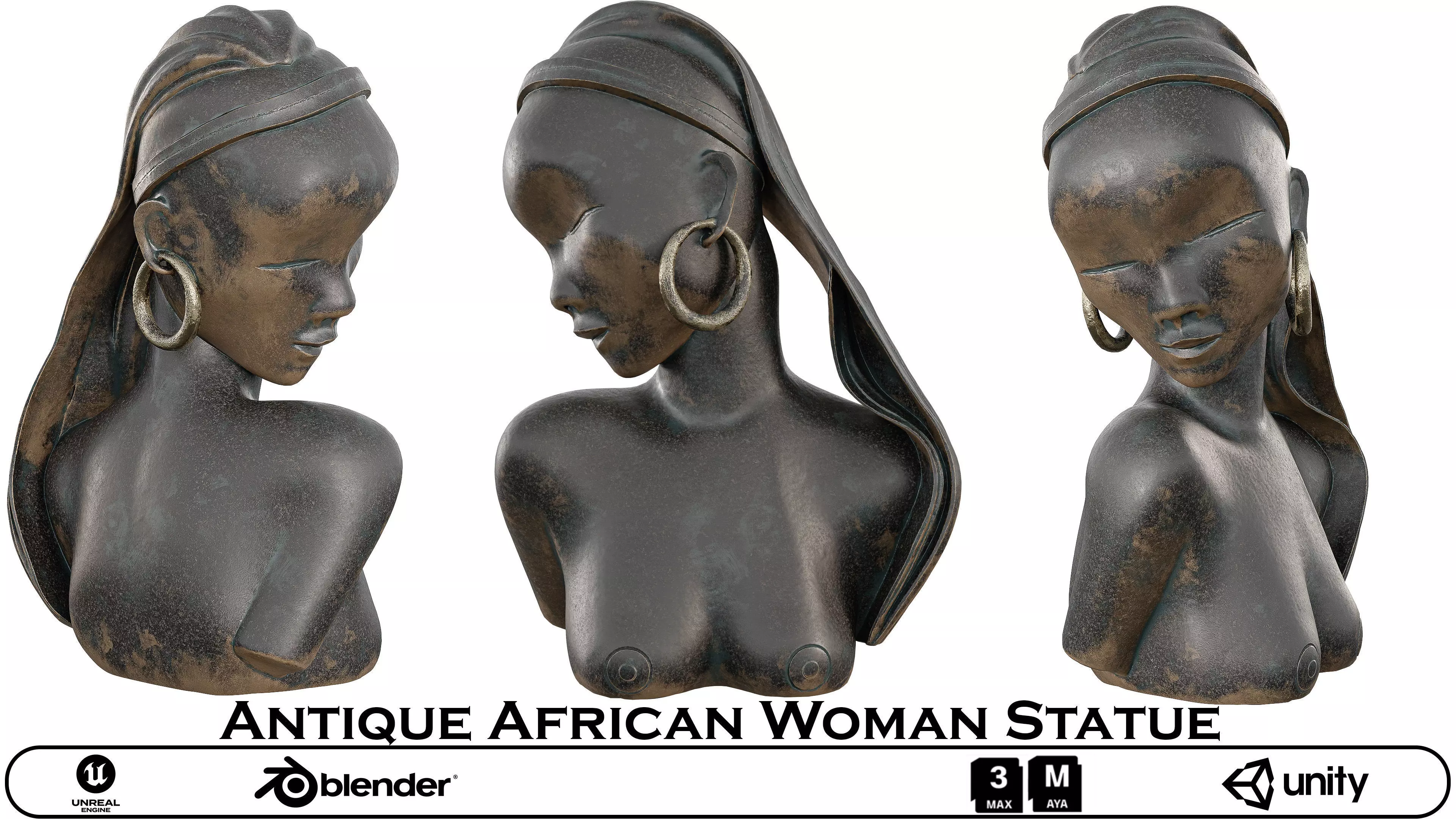 Name: Old African Stone SattueType: modelFormat: 3Ds Max 2013Export: FBX, OBJRender: VRay (5.x), Corona (9)Polys: 28939Verts: 28929Matclasses: VRayMtl,_CoronaPhysicalMtlUnits: CentimetersDimension: 67.85 x 41.51 x 97.78Date: 2025.8.21A highly detailed and realistic 3D model of an antique statue bust, depicting an African woman with traditional adornments. The piece features a weathered metal or aged wooden texture with a dark, rich patina. This artistic asset is perfect for adding a touch of cultural elegance and history to any scene. Ideal for museum visualizations, game environments, and historical renders.This premium 3D model captures the timeless beauty and cultural richness of a historical artifact, meticulously crafted to resemble a professional art sculpture. The bust features a woman with an intricate head wrap, a stylized hairstyle, and large hoop earrings. The model's materials are expertly designed to mimic aged metal or dark wood, with a realistic, slightly rough texture and a deep, multi-tonal patina that has developed over time. The textures capture subtle imperfections, scuffs, and natural wear, giving the sculpture an authentic, museum-quality feel.